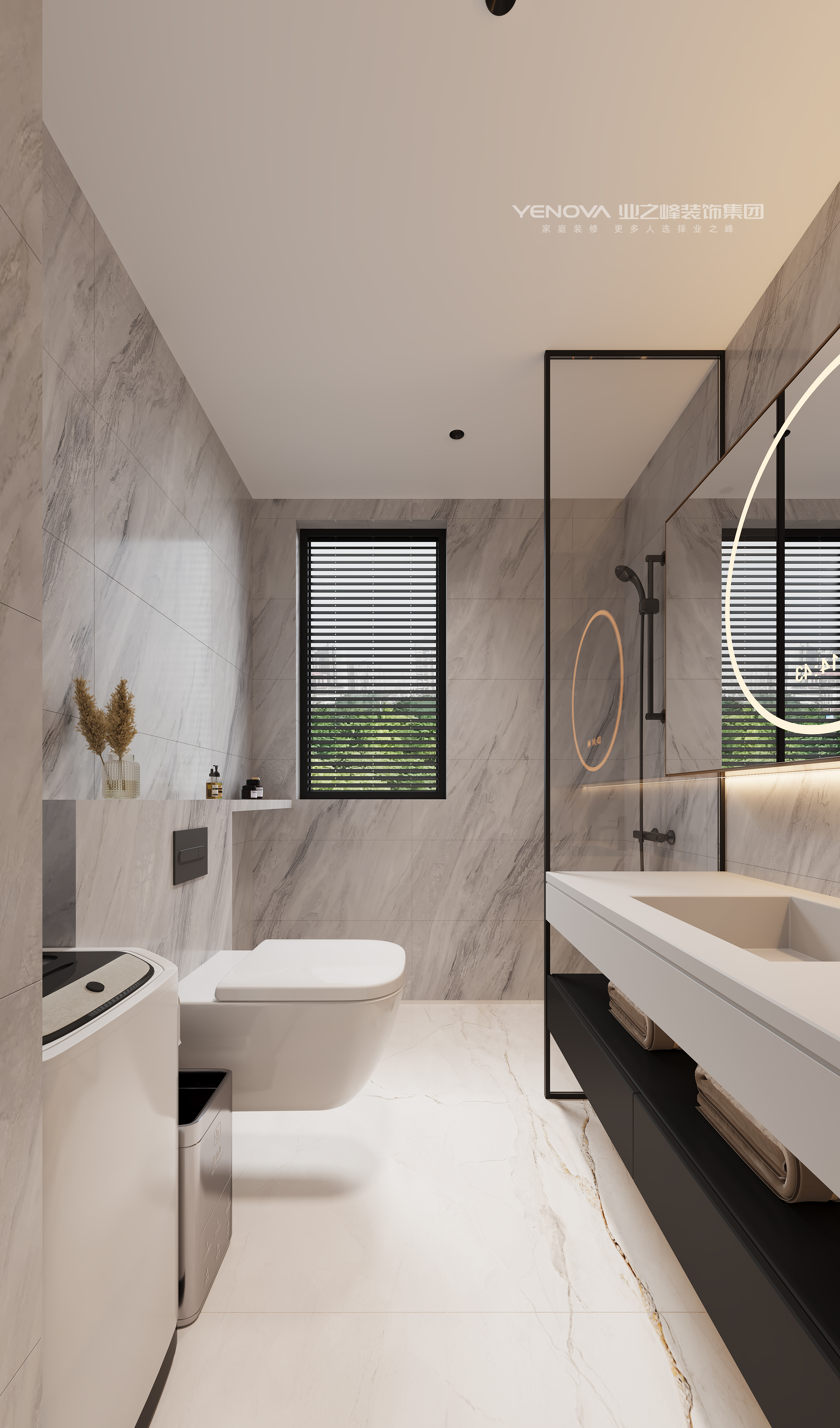 卫生间以灰色调为主,干湿分区明确,配备智能镜和简约卫浴设施,风格时尚实用。