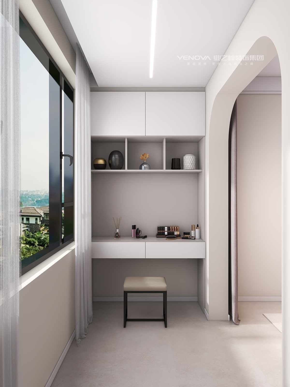 本案中,配色主要以奶咖为主的色系,搭配暖灰色、金属、原木色等,家具选比较厚重一点,搭配绿植;像后期软装上面搭配纹理感比较强的、羊毛地毯、亚麻沙发、棉麻的窗帘等都是不错选择,硬装上面吊顶一般采取圆弧设计和线条搭配为主,避免一些棱角,从而达到温馨而舒适的氛围,让人感到放松和愉悦。