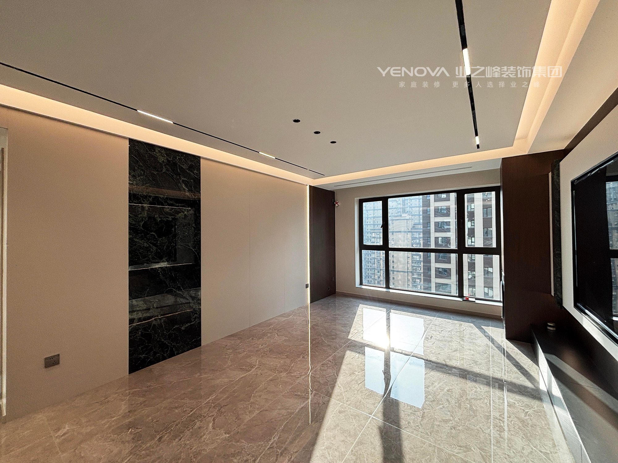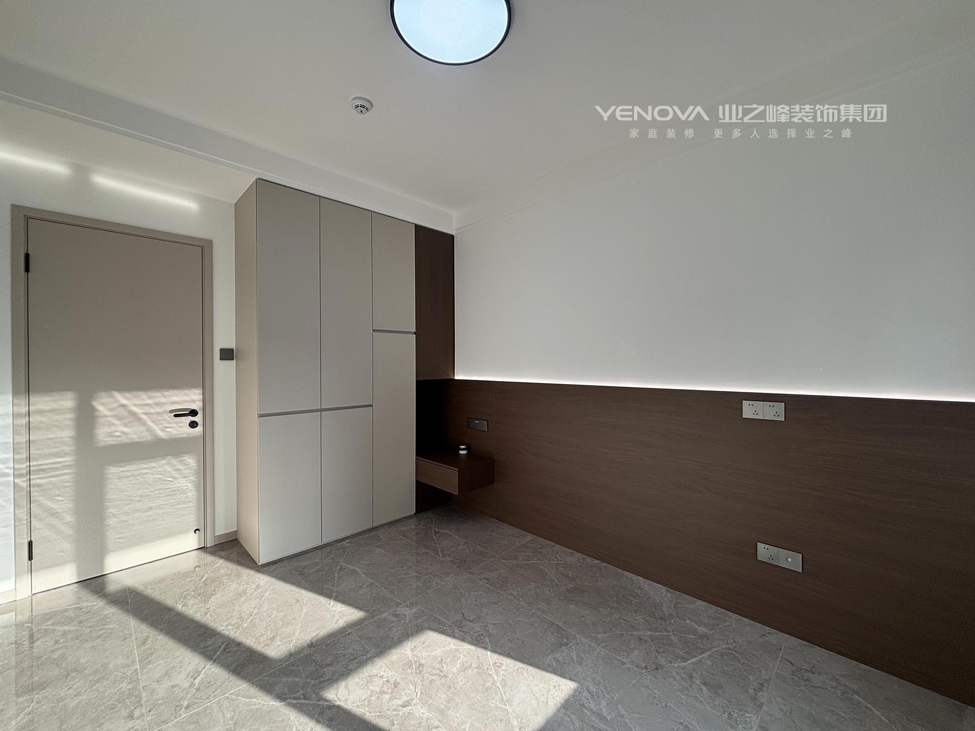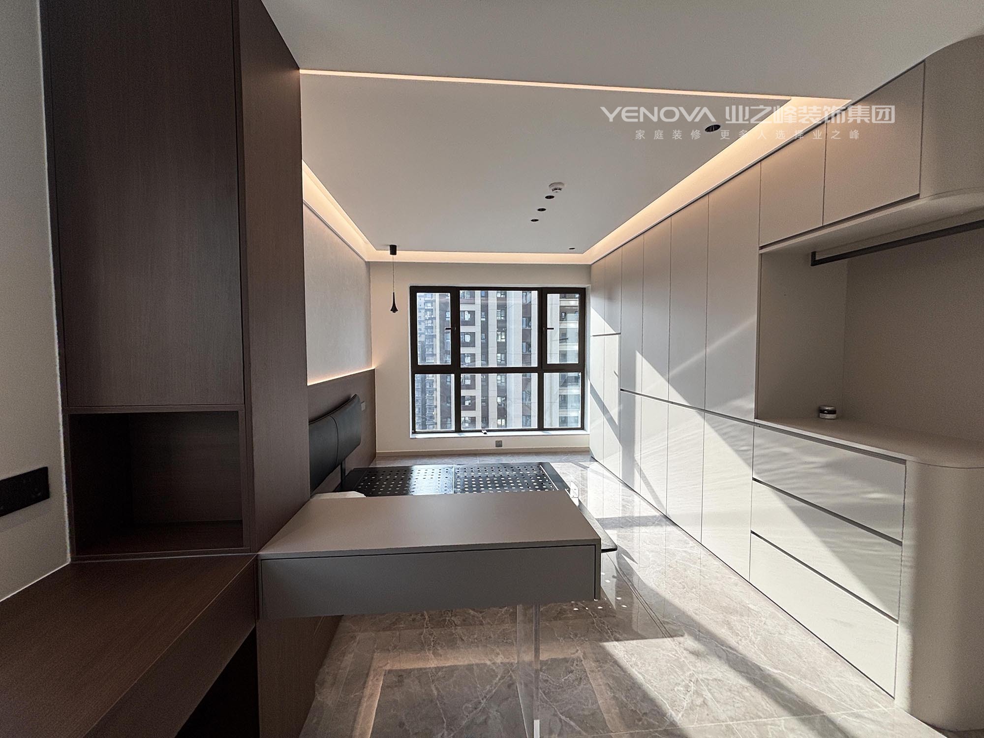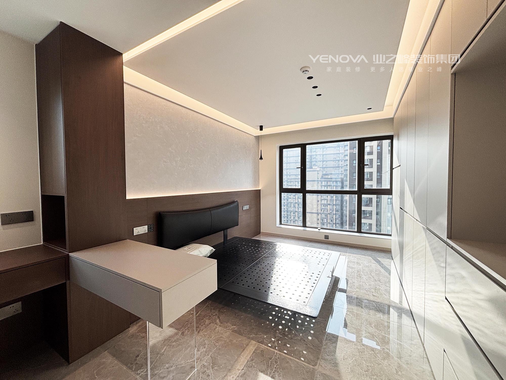 这是一套实景落地拍摄,卧室定制衣柜嵌入墙体,营造整洁静谧氛围;全屋以米灰、深棕为基调,搭配大理石、玻璃等材质,在极简形态中尽显意式美学的高级质感与生活温度。