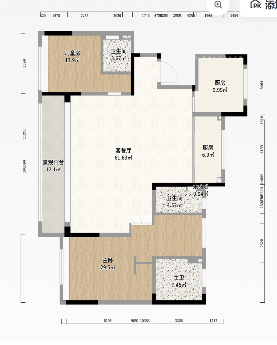 这是一套布局较为宽敞的户型。客餐厅面积达61.63㎡,空间开阔,适合家庭聚会和日常休闲。景观阳台面积为12.1㎡,采光与视野俱佳。主卧29.5㎡,带7.45㎡主卫,居住舒适度高。儿童房面积13.9㎡,可满足孩子学习与休息需求。