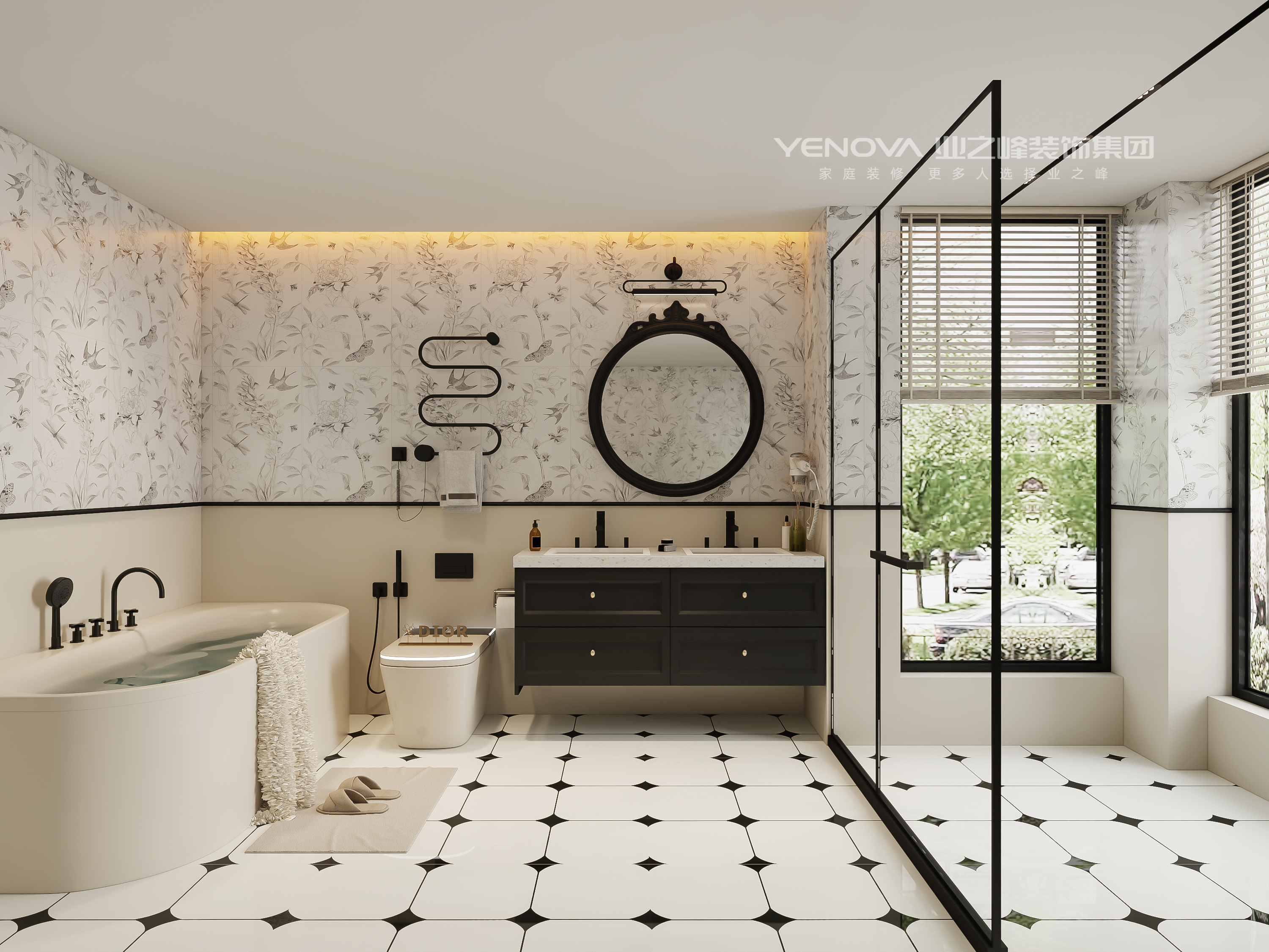 空间设计以法式风格为主,极尽奢华、富丽堂皇,线条利落、清晰,装饰恰到好处,凸显庄重与优雅。负一楼入户门进来左手边是茶室,旁设法式沙发,沙发前是庭院,种植有绿植和花朵点缀。入户门右边利用角落空间,打造钢琴角,保持空间视觉的整体性与美观度,成为浪漫角落。一楼楼梯右手边的餐厨区设置圆形雕花餐桌与米色餐椅,还有米色的吧台,营造兼具仪式感与舒适度,打造浪漫的法式用餐氛围,前面是家庭交流中心,利用高挑空、大型窗户来引入光线,营造通透感设法式沙发与复古落地灯,美观且优雅,打造法式壁炉休闲区,壁炉采用石材雕花造型,采光井是空间通透明亮。楼梯左手边的卫生间采用法式黑白地砖,线条对称,色彩柔和。客房采用深色实木地板提升精致度,墙面以米白色质感乳胶漆为基地搭配法式浮雕营造层次丰富的视觉效果,利用户型的户外衔接空间,打造法式花园过渡区,通过铁艺雕花栏杆、法式绿植花境,实现室内外风格的自然衔接。三楼洗衣房与阳台宽敞,将法式浪漫延伸至户外。
