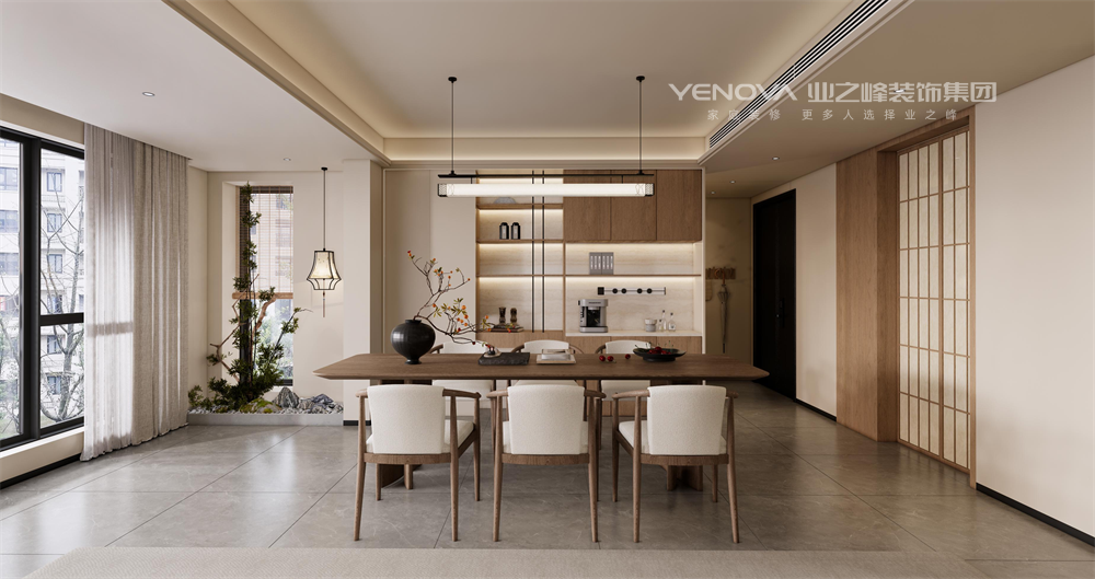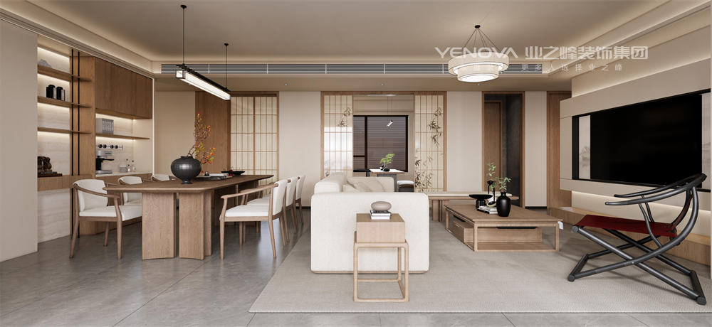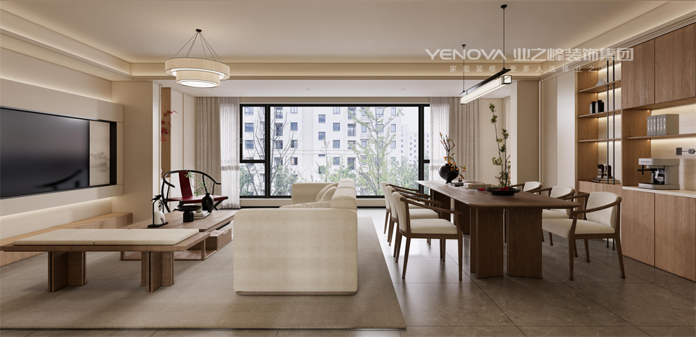 客餐厅采用一体化设计,动线流畅且空间通透。通过顶面局部跌级吊顶划分功能区域,视觉上更具层次感。客厅摒弃繁琐装饰,以 “少即是多” 的设计理念,搭配简约中式沙发与一体化收纳电视柜,兼顾美观与实用性。餐厅选用深色系餐桌餐椅,搭配原木色与白色相间的餐边柜,营造沉稳大气又不失温馨的用餐氛围。