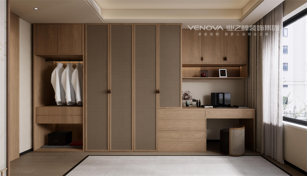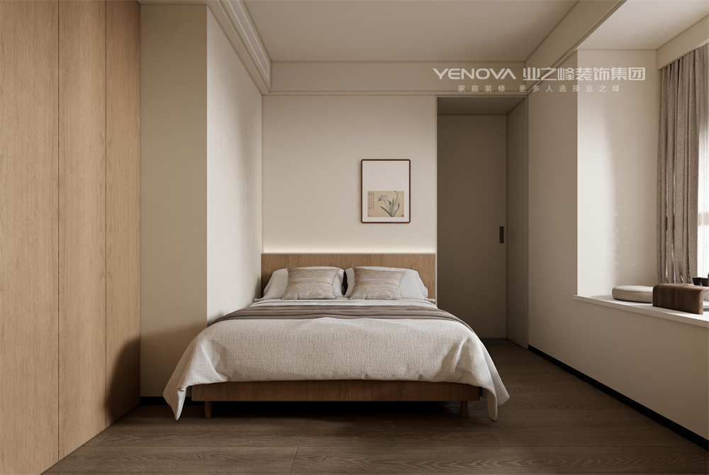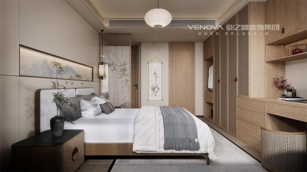 四间卧室功能明确,主卧以雅致色调为主,床头背景墙采用中式护墙板设计,搭配柔和灯光,打造静谧舒适的休憩空间。两间次卧分别规划为老人房与客房,色调温和,布局简洁实用,满足家人及宾客居住需求。第四间卧室改造为多功能书房,设置榻榻米与展示收纳柜,兼具办公、阅读、储物及休闲功能。