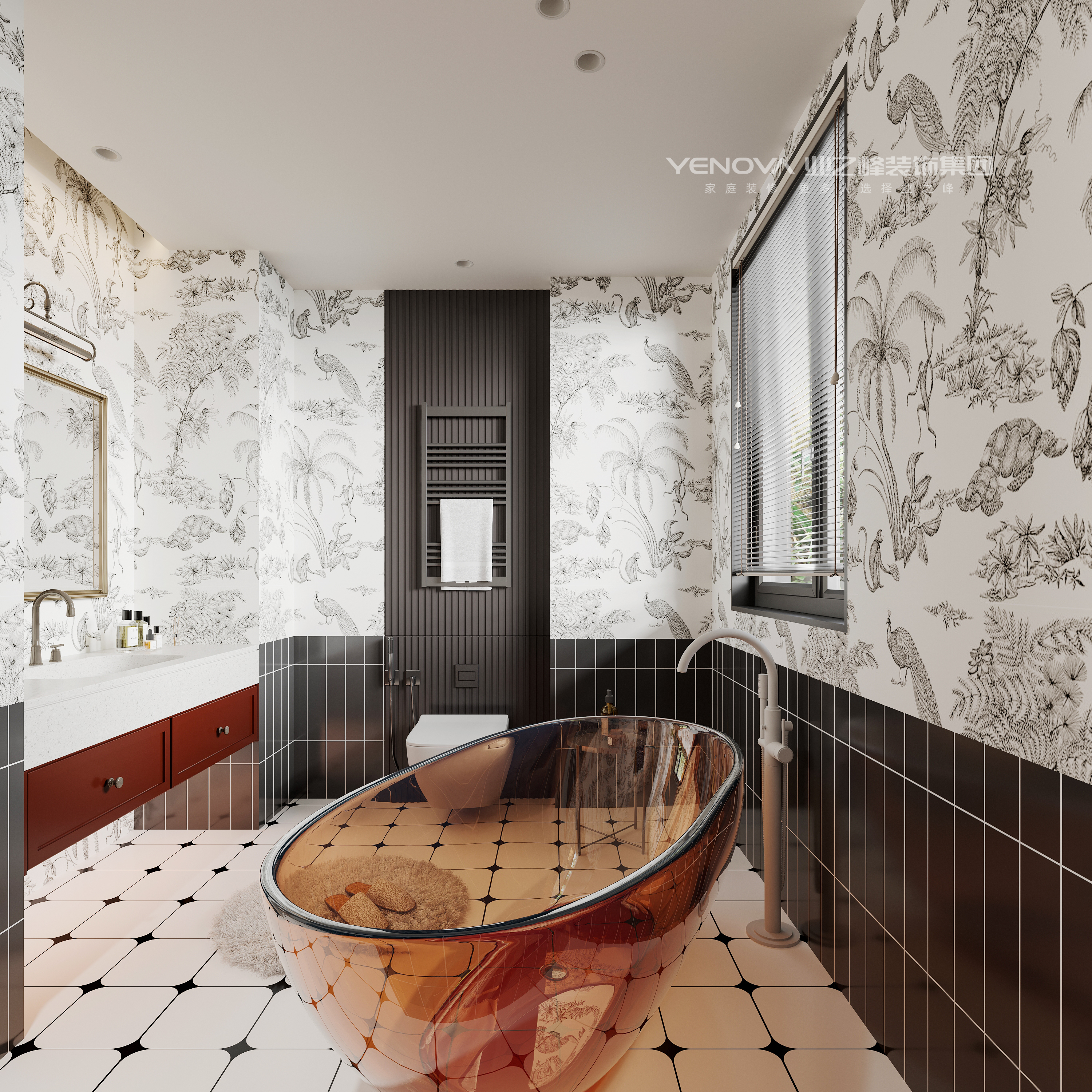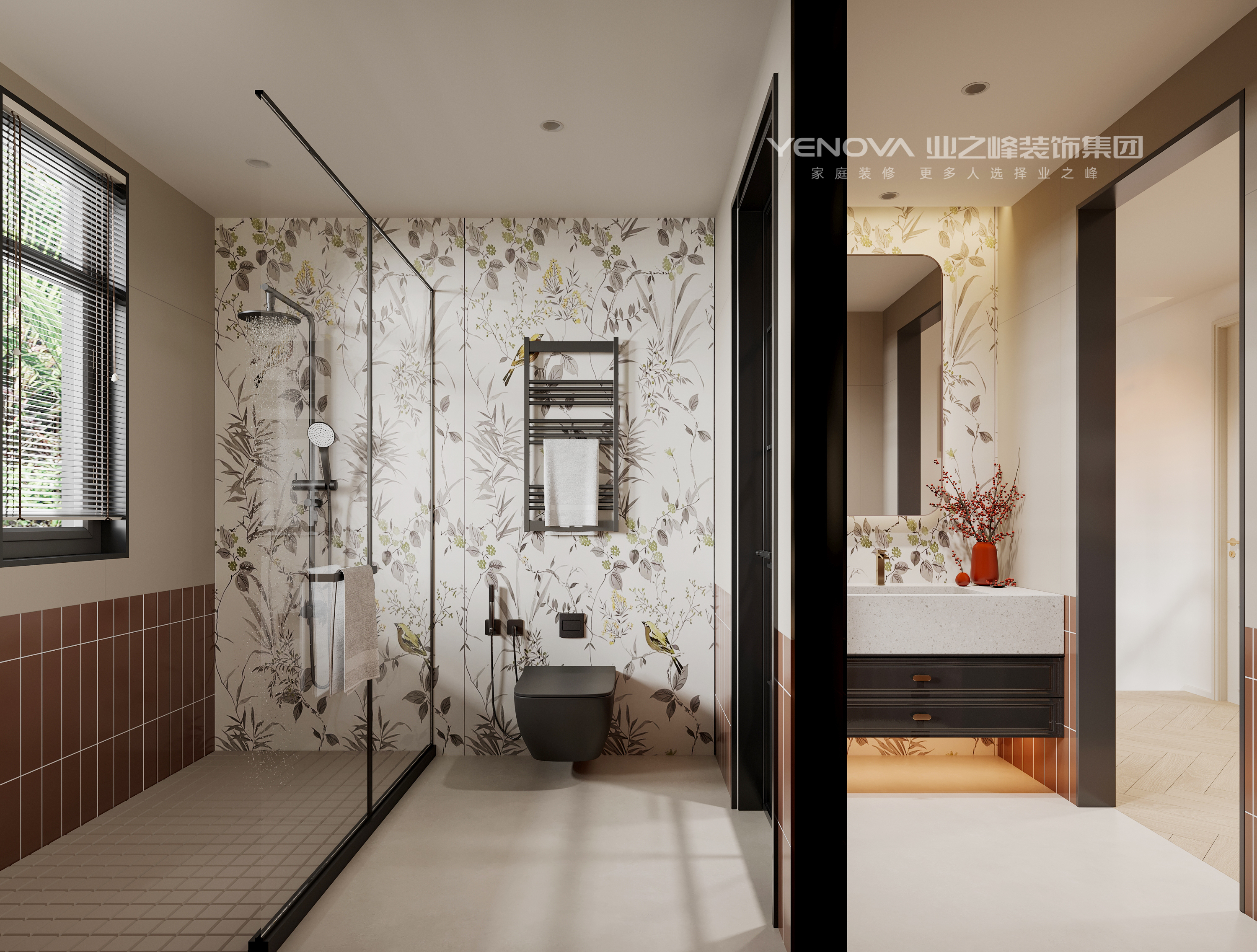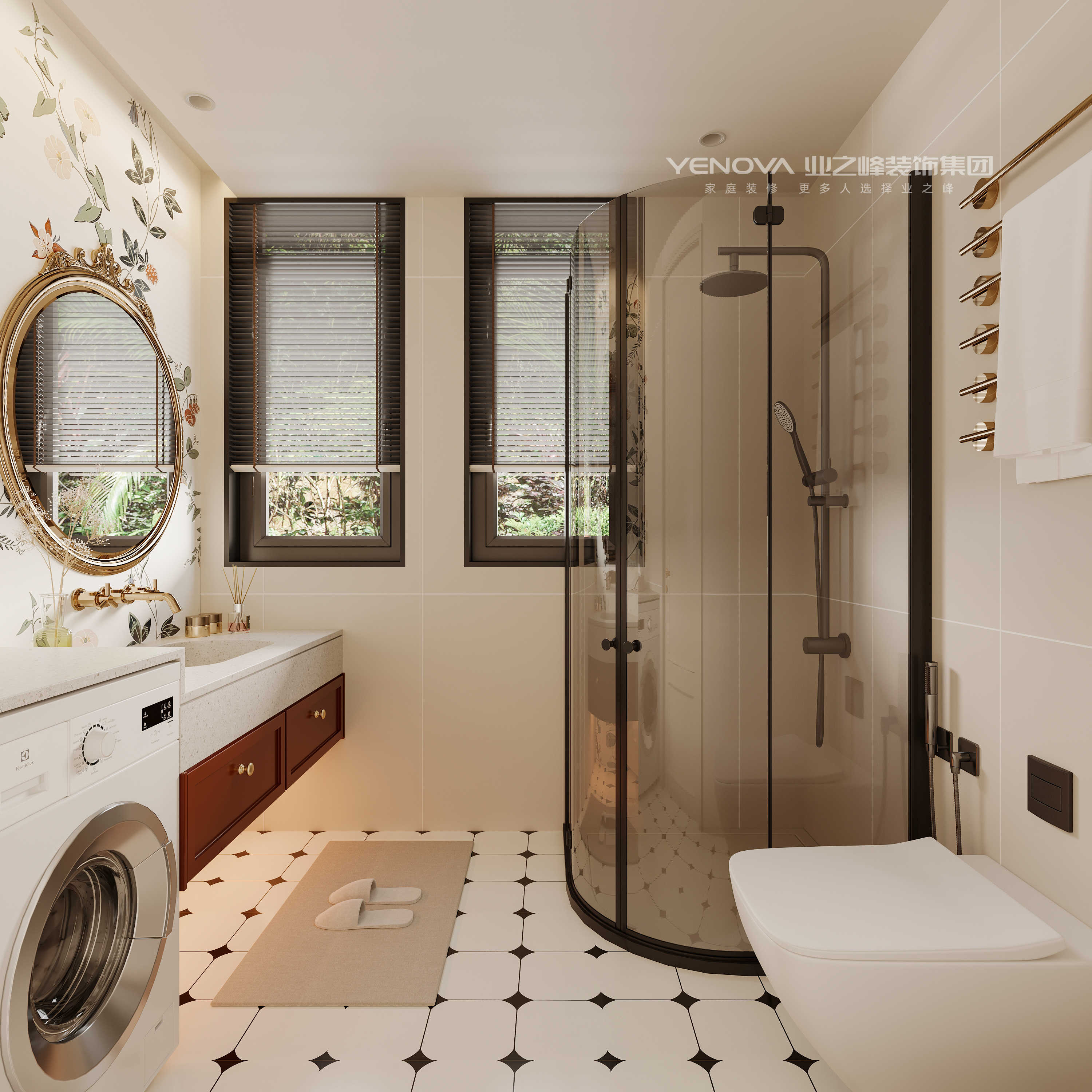 5卫生间的地面用小方砖,墙面花砖上墙,体现了复古的感觉,还原了法式风格的浪漫和优雅,整体效果,温柔清新。