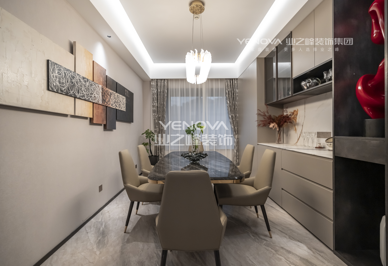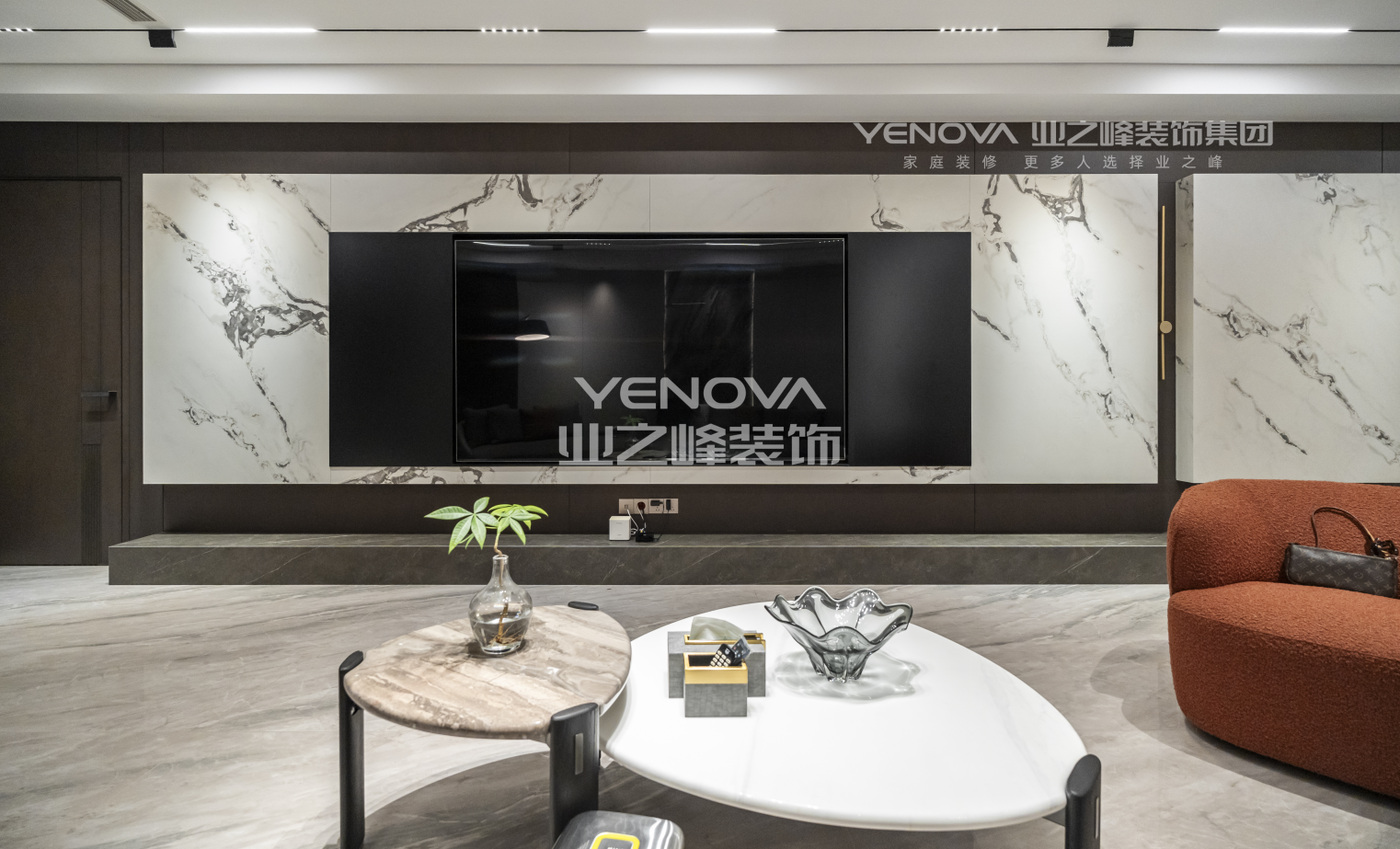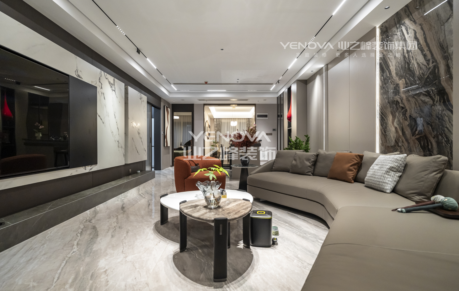 以中性色深棕为主,营造沉稳优雅的氛围。通过木材与石材的冷暖对比强化轻奢感。空间布局上我们将