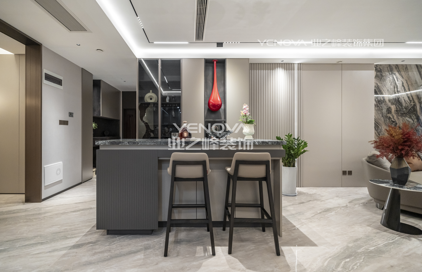 客厅、餐厅与水吧打通,增强空间通透感,给视觉一个延伸。其次通过