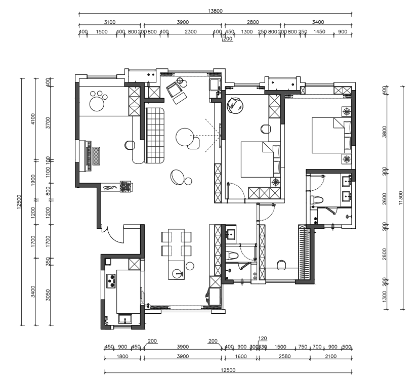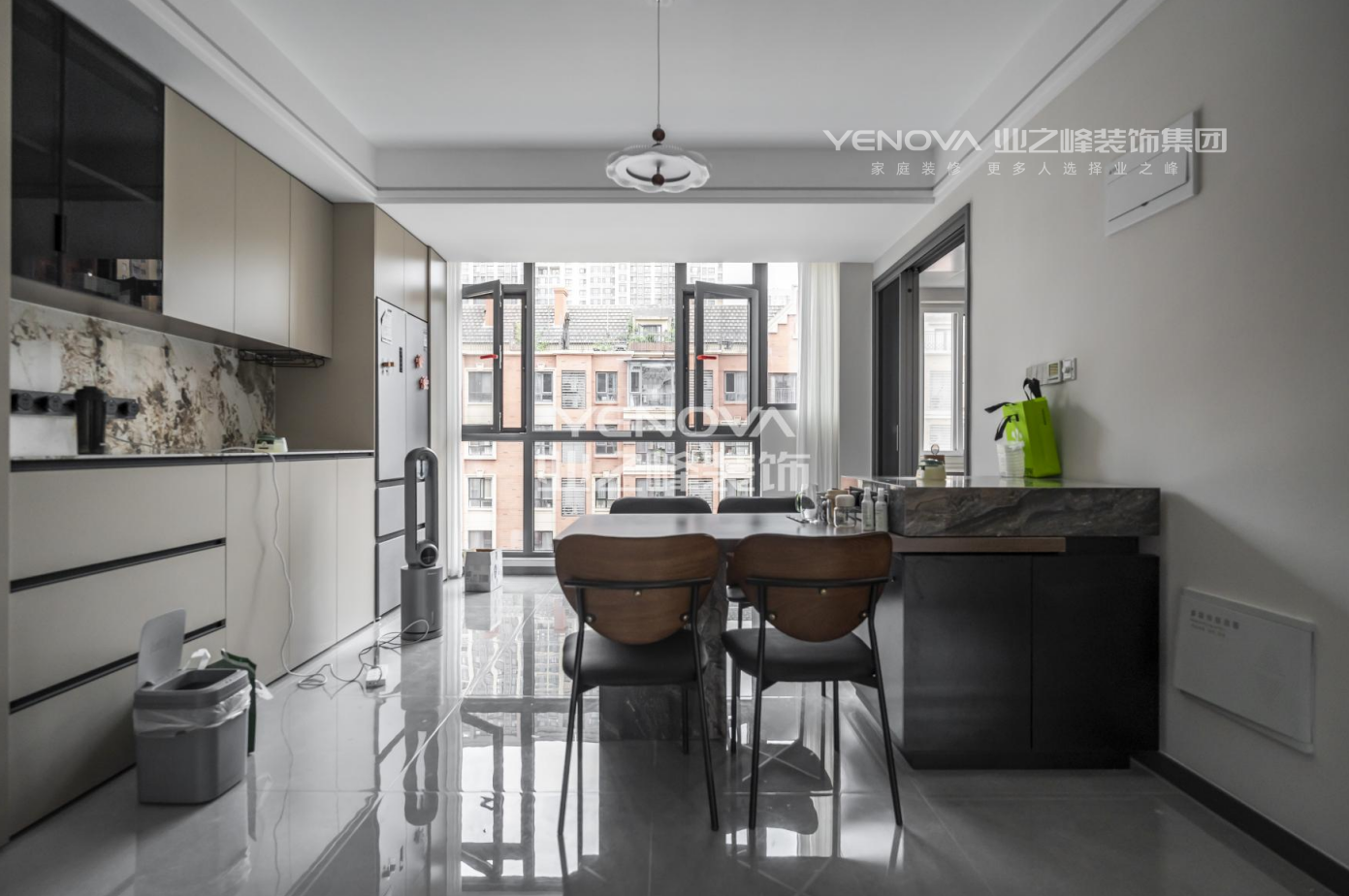 本次设计将160㎡现代简约四居室改造为两居室,打破原有隔墙限制,通过开放式布局最大化空间流动性与采光。保留主次两间卧室,主卧整合原两间次卧形成套房,配备独立衣帽间及三分离卫浴;次卧采用隐形推拉门与公共区灵活分隔。拆除客厅与一间卧室隔墙,拓展为复合型起居空间,结合悬浮式书柜与隐藏式投影幕布实现休闲、办公、娱乐多功能。餐厨区改为12米连贯岛台,集成电磁炉、洗碗机与收纳系统,搭配可伸缩餐桌满足6-10人用餐需求。全屋采用微水泥地面通铺,墙面以艺术涂料与木饰面穿插,线性灯带与磁吸轨道灯构成无主灯照明系统。定制柜体均采用顶天立地设计,内置新风、地暖及智能家居控制系统,在简化视觉线条的同时提升实用功能。卫生间干区外置并与玄关收纳整合,玻璃砖隔断保证透光性。改造后得房率提升15%,动线缩短40%,实现开阔通透的现代极简生活场景。