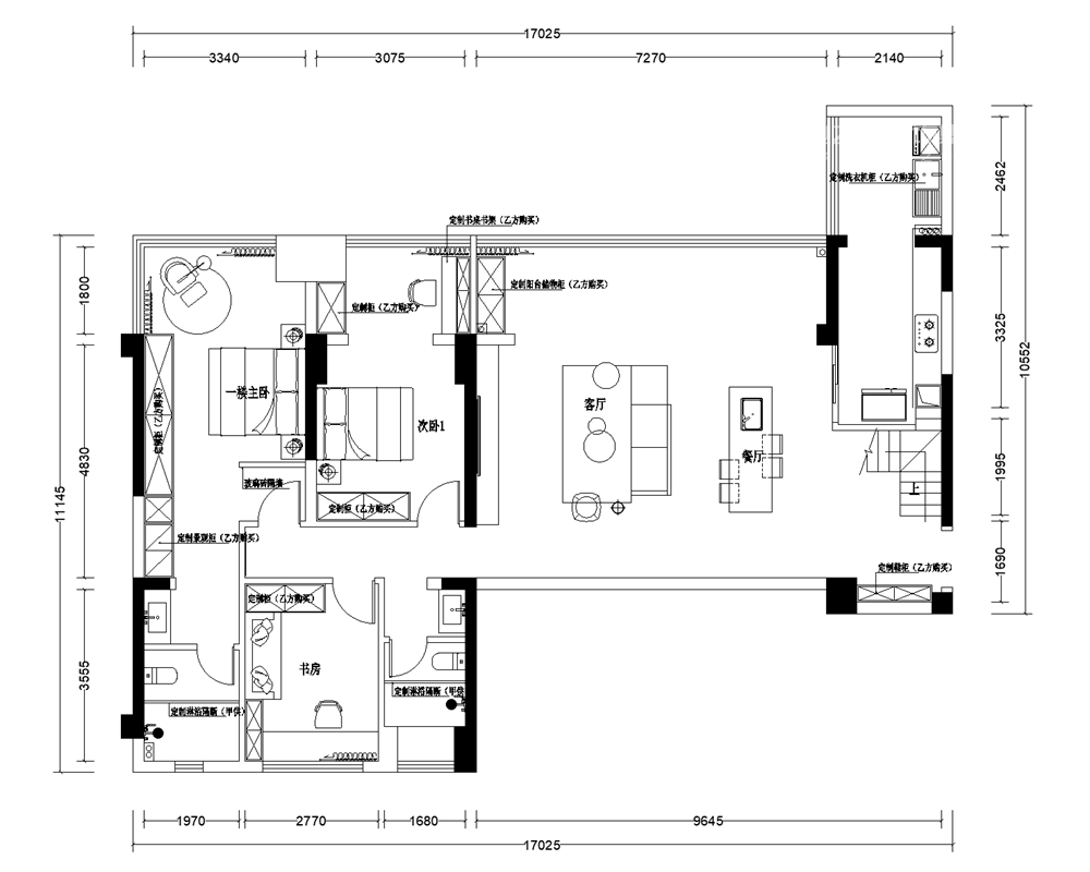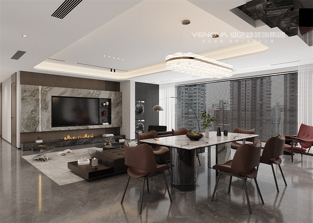 本案餐厅与客厅为同一个空间。岩板系餐桌深色餐椅,沉稳大气。沙发黑色,质感强烈,电视背景墙岩板上墙,局部点缀饰面板。顶面采用平顶加圆弧边顶的吊顶方式,同时在边顶上增加反光灯带,使得整个空间的灯光更有层次感。客厅阳台搭建完毕以后采用的是平顶吊顶方式,灯光设计也采用轨道灯具及筒灯的形式,进一步的提高了整个客餐厅区域的灯光效果。