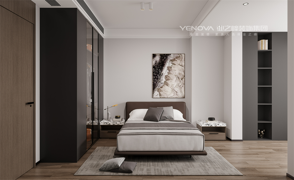 墙面浅灰色乳胶漆,顶面不做吸顶灯,以明装筒灯作为照明光源,墙面一副黑白灰挂画,顶面采用叠级吊顶,视觉上更有层次感。