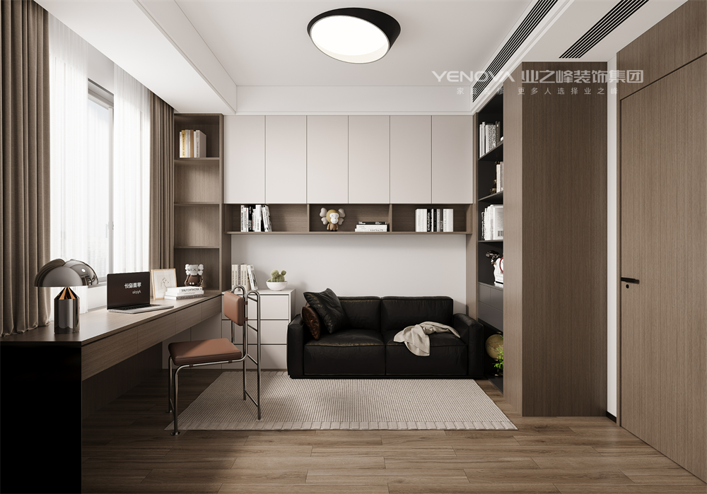 书房为多功能室,再满足办公,学习的同时还要有收纳和展示的作用。业主平时也可以在此看书学习,搭配沙发床,过节期间家里亲戚朋友来玩时也可多一个房间。