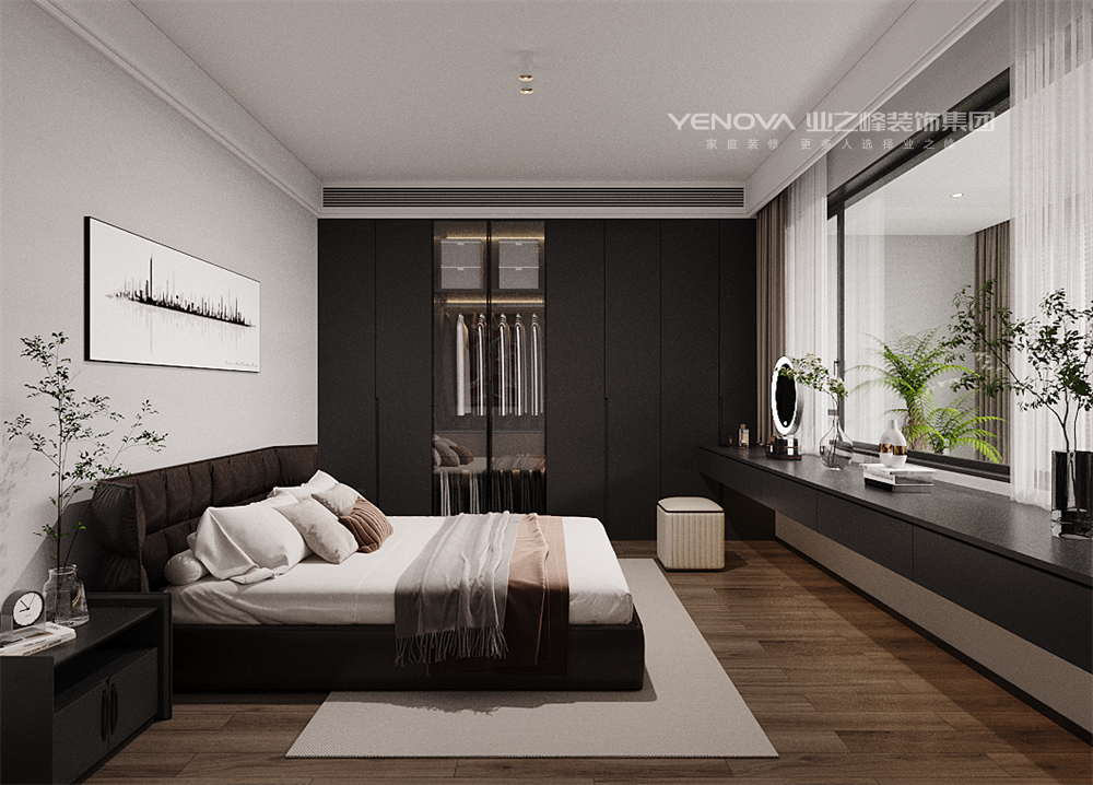 主人房墙面浅色乳胶漆,床头位置正对落地大窗户,本案朝向为东西朝向,早上起来一缕初升太阳照在房间内,金色的光芒洒满整个房间,开启一天的美好生活。衣柜靠内设置,搭配二楼过道外的衣帽间,储物空间足够。落地窗下做满书桌,下雨的时候坐在窗前看着外面淅淅沥沥的雨,闲暇之余,可以看看书,喝喝茶。