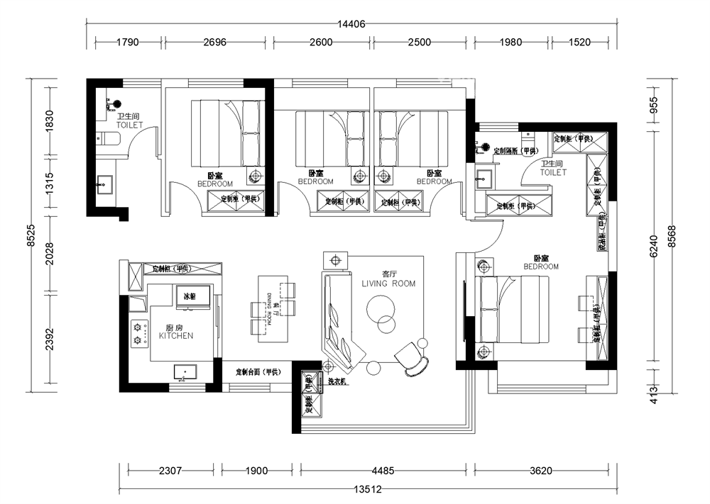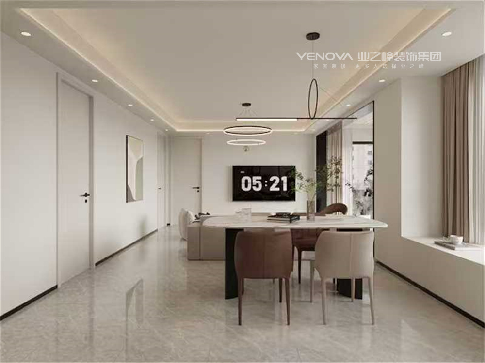 本案餐厅与客厅为同一个空间。岩板浅色系餐桌搭配撞色餐椅。浅色系沙发,提亮整个空间,电视背景墙不做造型,乳胶漆饰面。顶面采用边顶加灯带的吊顶方式,使得整个空间的灯光更有层次感。客厅阳台不做吊顶,不拘泥与传统吸顶灯的形式,而采用吸顶条形灯。利用餐厅旁边飘窗,在整个客餐厅空间增加一组储物柜