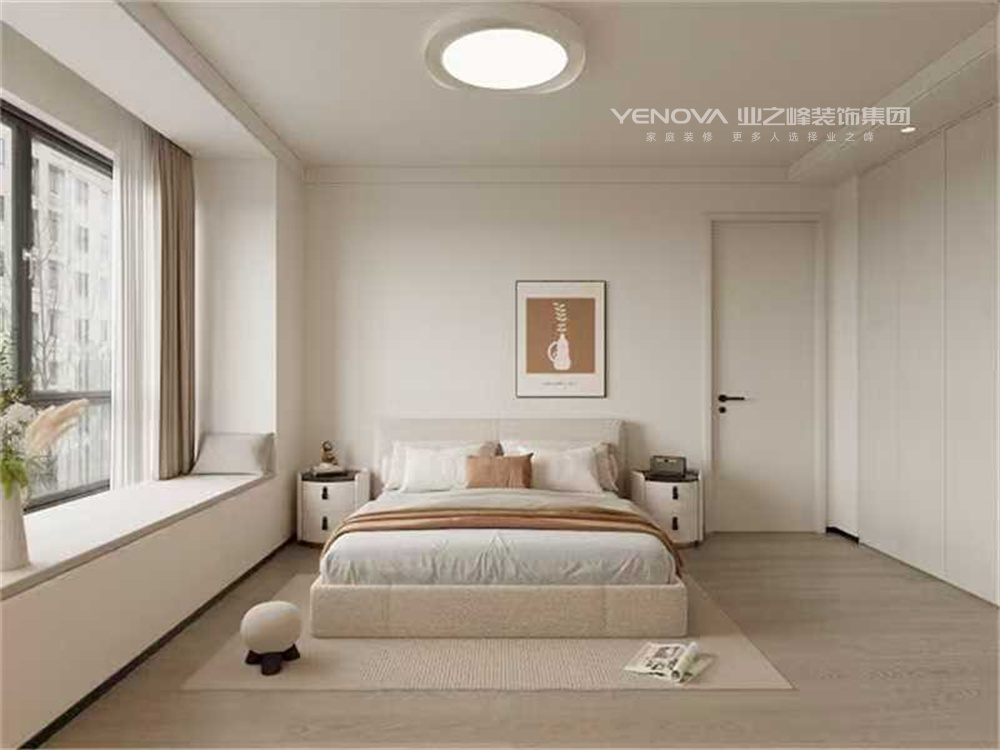 主卧的色调与客餐厅色调保持一致,墙面刷浅色乳胶漆,地面原木色木地板,脚感舒适质感强烈。业主在反复思量,最终还是将原来开发商给到的床位置调换,床尾位置也为夫妻二人考虑办公书桌,在休息与工作中间自由转换。