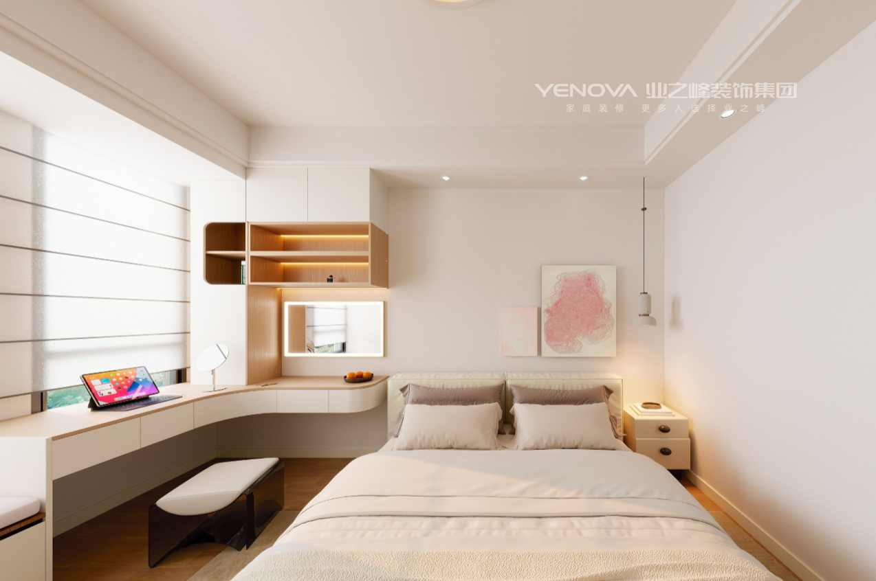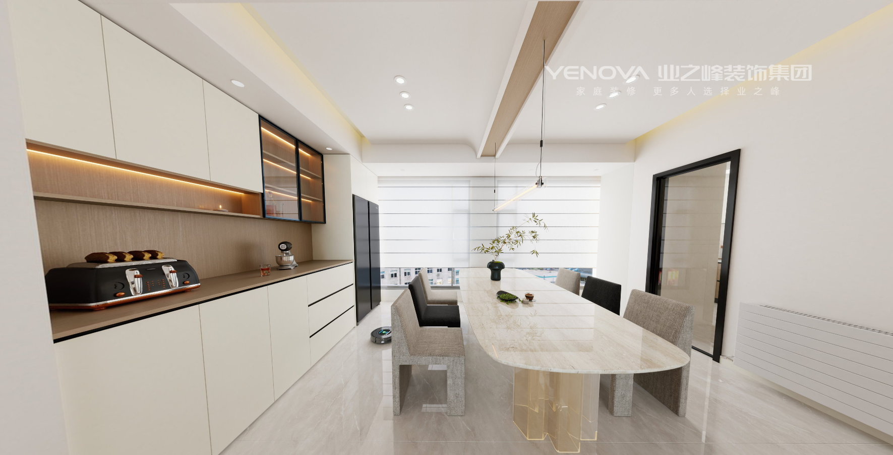 本套房屋卧室柜体材质保留了木饰面原有的纹理质感,浅色原木和玻璃柜门的碰撞,和现代风格相呼应,餐厅桌面的大理石有为其添加了一丝独特的奢华感