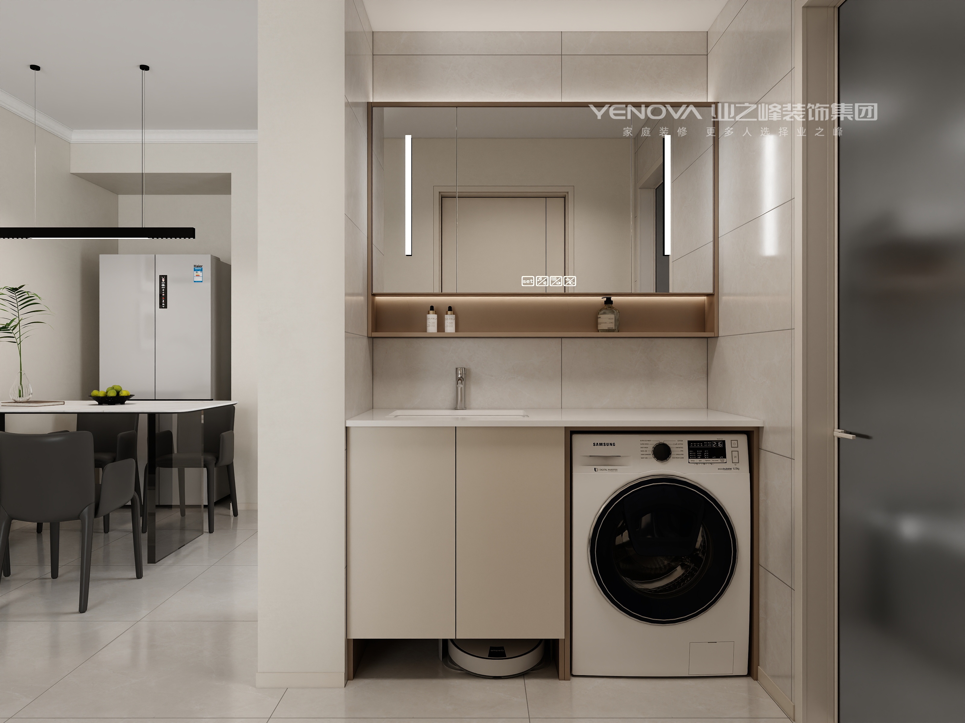 - 功能巧思:隐藏式收纳(柜门无把手设计)、嵌入式家电(冰箱、洗衣机)、灵活置物(墙面层板),既保持了视觉整洁,又兼顾了日常实用需求。