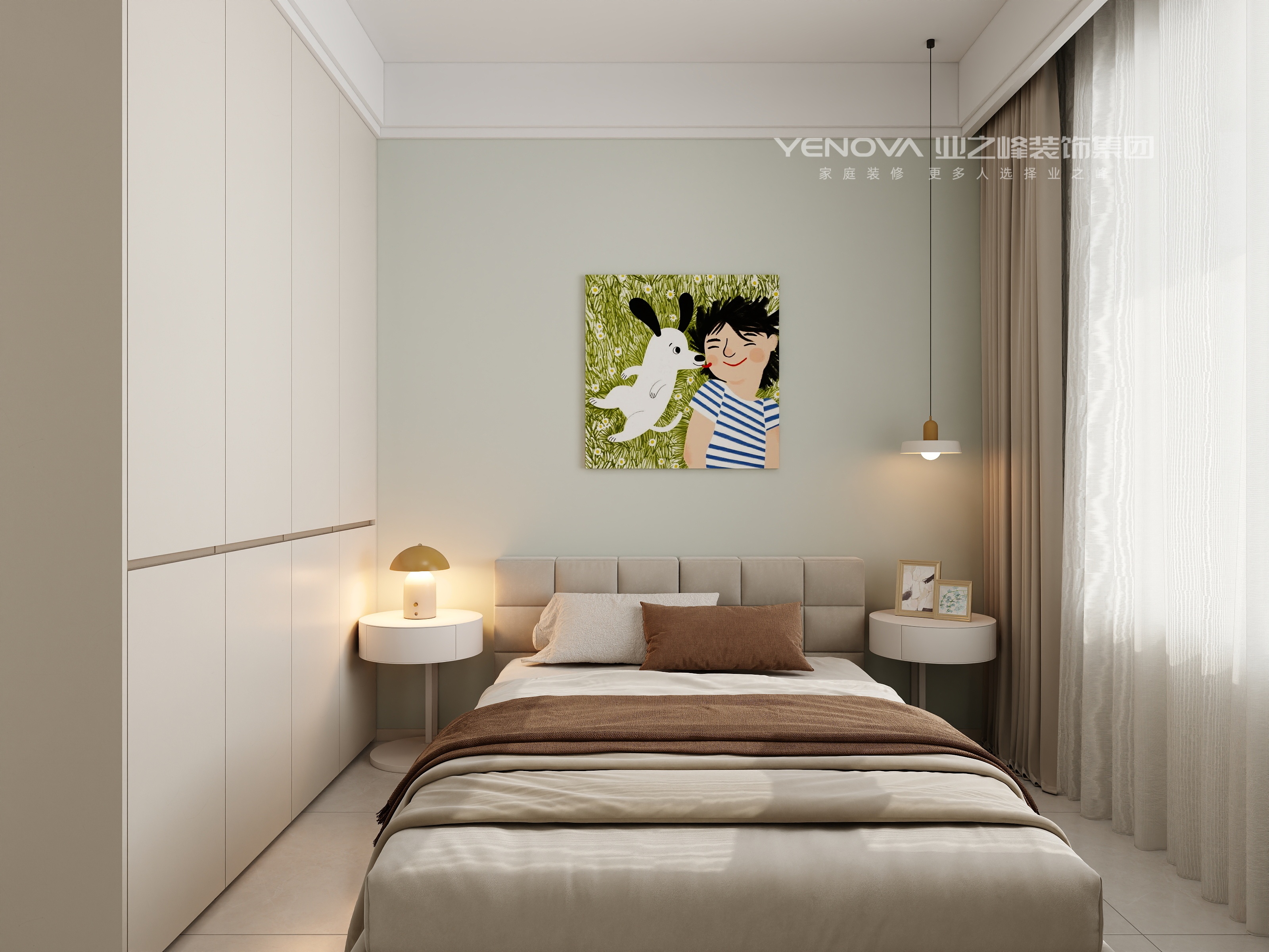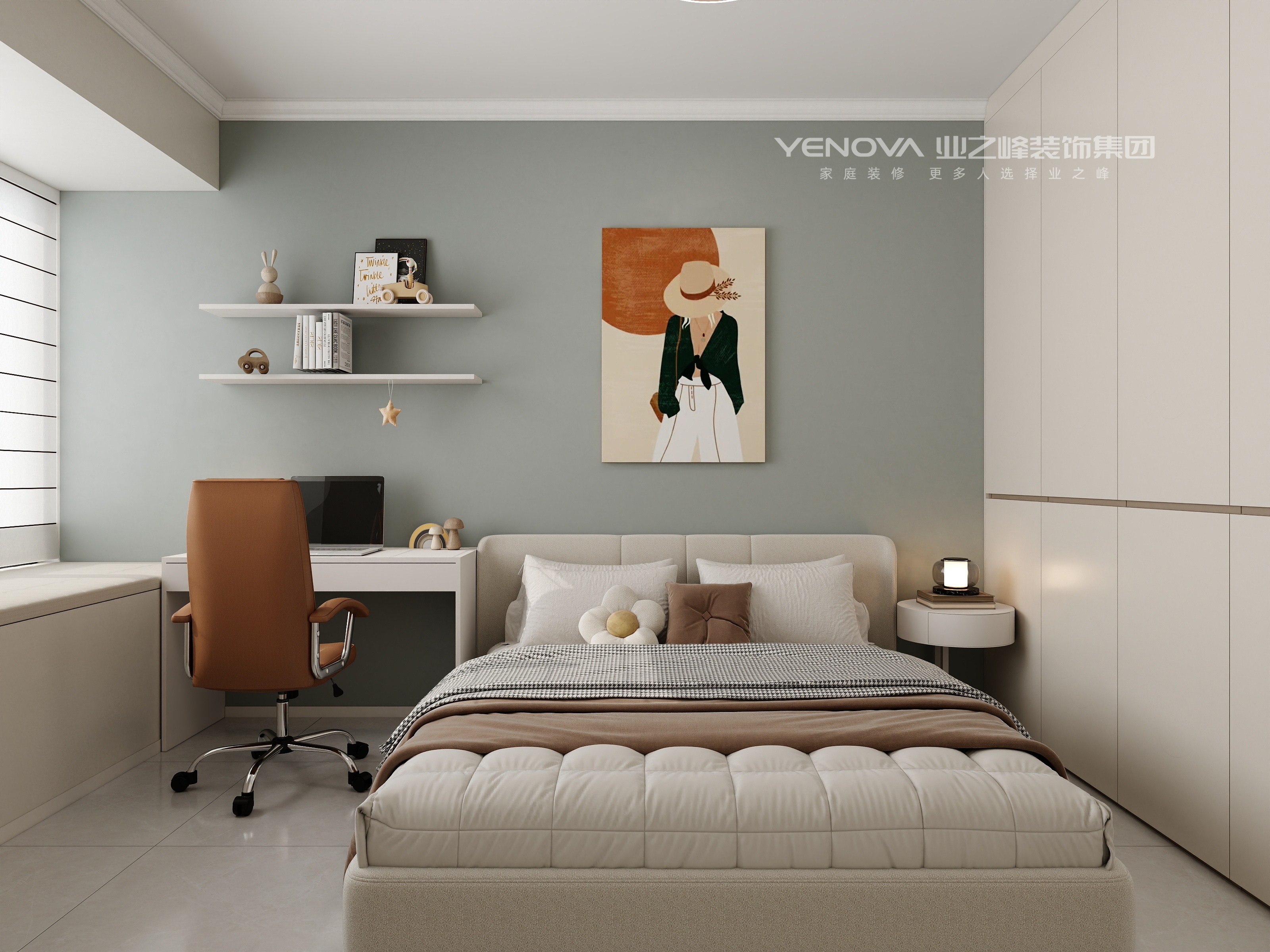主卧(或次卧)结合“睡眠+轻办公”功能,书桌与飘窗(或窗台)衔接,利用墙面置物架替代厚重书柜;儿童房(或次卧)以浅绿墙面+童趣装饰画营造温馨感,大衣柜满足收纳需求。