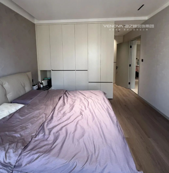 主卧用低饱和紫调床品+皮质床头,温柔又高