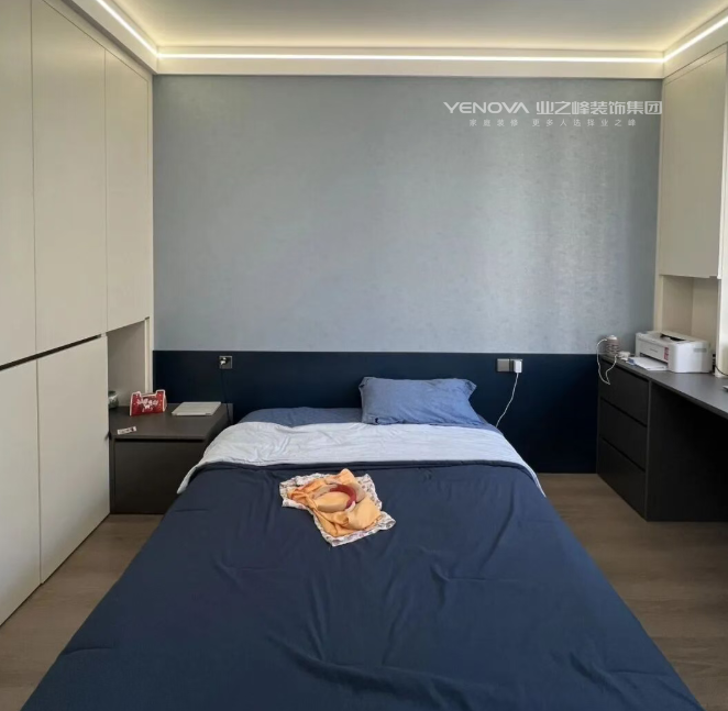 次卧的藏青色背景墙+书桌,兼顾休憩与办公