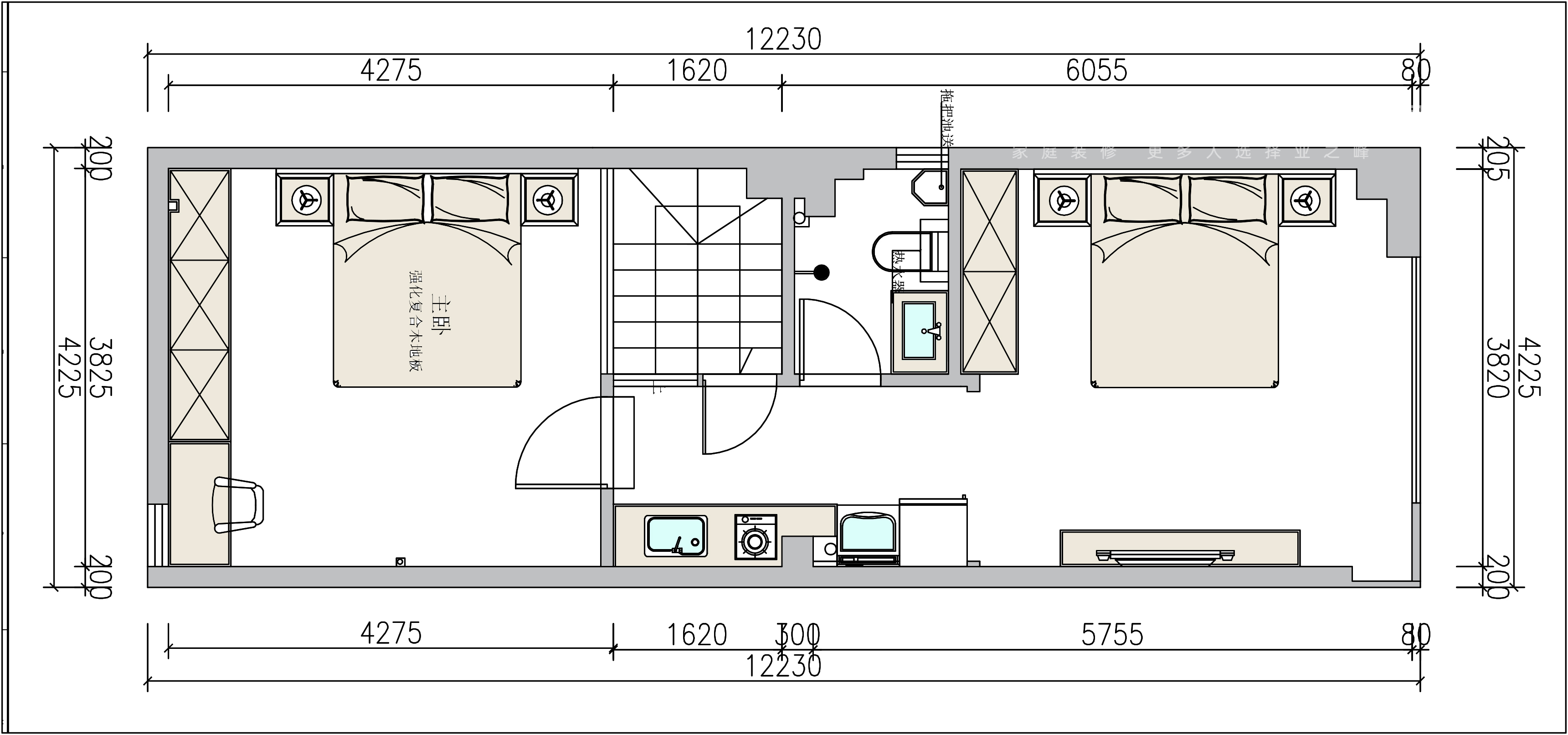 业主前期自己住,后期应该会出租。整个设计采用暖色系,白色配木纹的搭配更显得温馨。家里因为是loft做两层层高不足,所以全房没有设计吊顶,因为吊顶会压低层高导致后期空间比较压抑。一楼地面采用暖色柔光砖通铺,家里显得更加明亮和视觉延伸感更强,空间显得更大。一楼卫生间和楼梯相结合更加的节约空间,利润率更高,这样厅里空间会更大。全房采用木纹色空间更加温馨,然后把一楼侧边从新开门也方遍后期出租,两家业主互不打扰,同时也方便后期业主出去露台做晾晒。二楼把户型外扩借用楼梯过道空间做卧室,这样可以增加一个卧室空间。