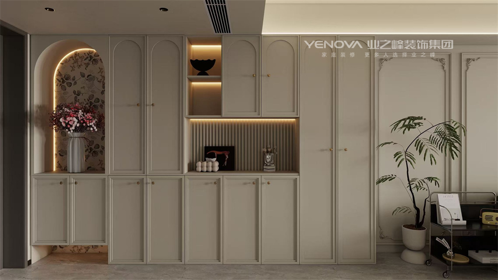 一体化柜体设计:将客厅收纳与空间美学结合,打造整面定制柜,以拱形展示区、带灯开放格与封闭柜门的组合,既满足大量物品的收纳需求,又通过灯光与装饰摆件展示生活品味,让收纳“隐于形,显于美”。