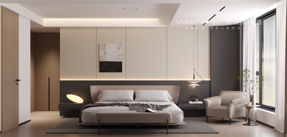 以米灰为主色调,通过双床头背景墙(浅棕与深灰)、艺术挂画与个性灯具塑造高级感,独立衣帽间满足收纳需求,整体设计简约大气,契合中年夫妻对品质独处空间的要求。