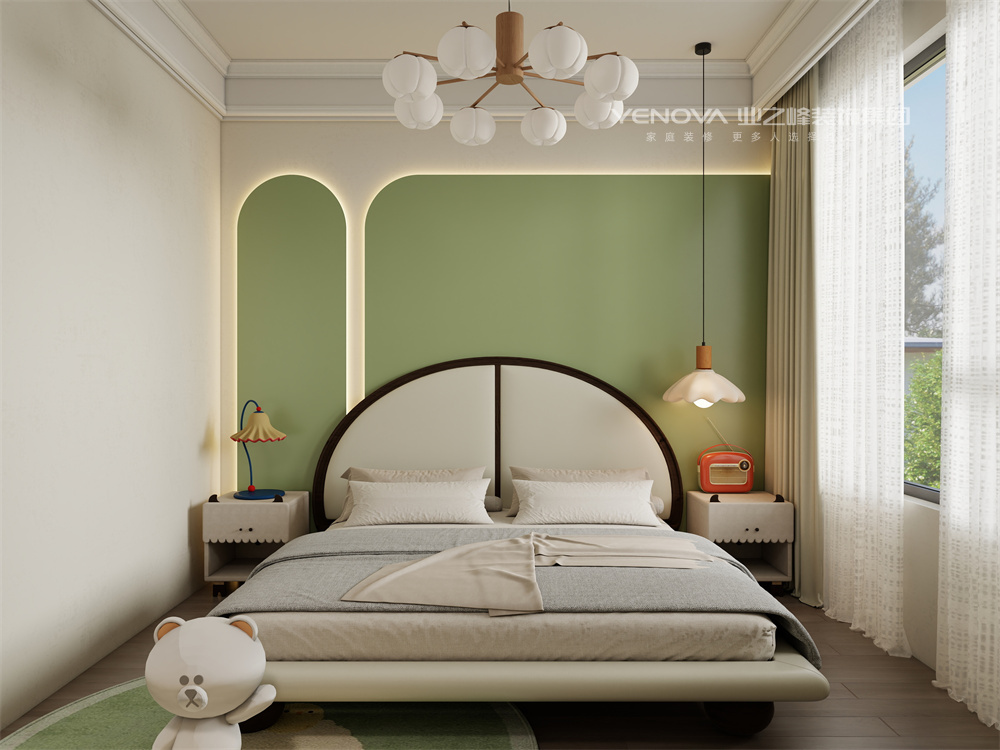 孩子的卧室以清新绿为主色,搭配弧形造型与趣味灯具,营造童趣又不失质感的成长环境;同时,全屋预留安静的学习角落(如卧室或书房区域),通过空间的动静分区,保障孩子专注的学习氛围。