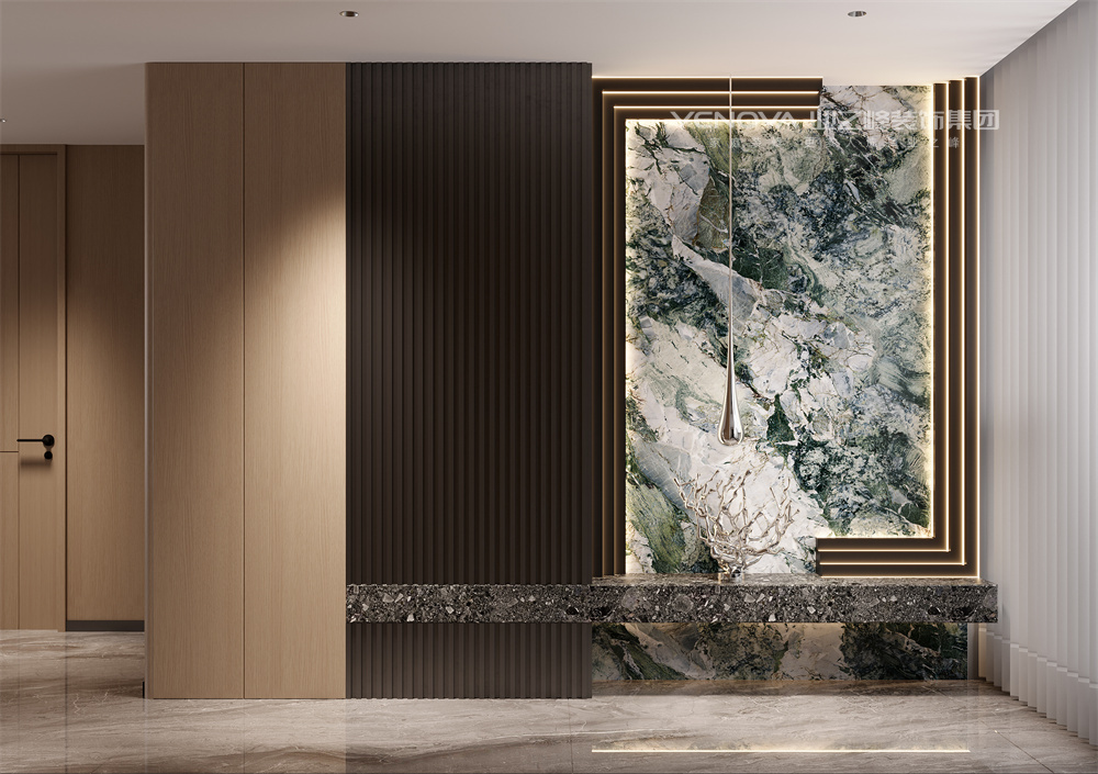 玄关的层叠灯光+奢石背景、客厅的电子壁炉与大尺寸电视墙等设计,既通过造型与材质的创新体现新颖感,又以中性色调与简约线条确保风格不过时。
