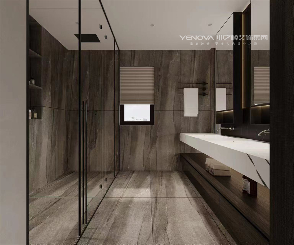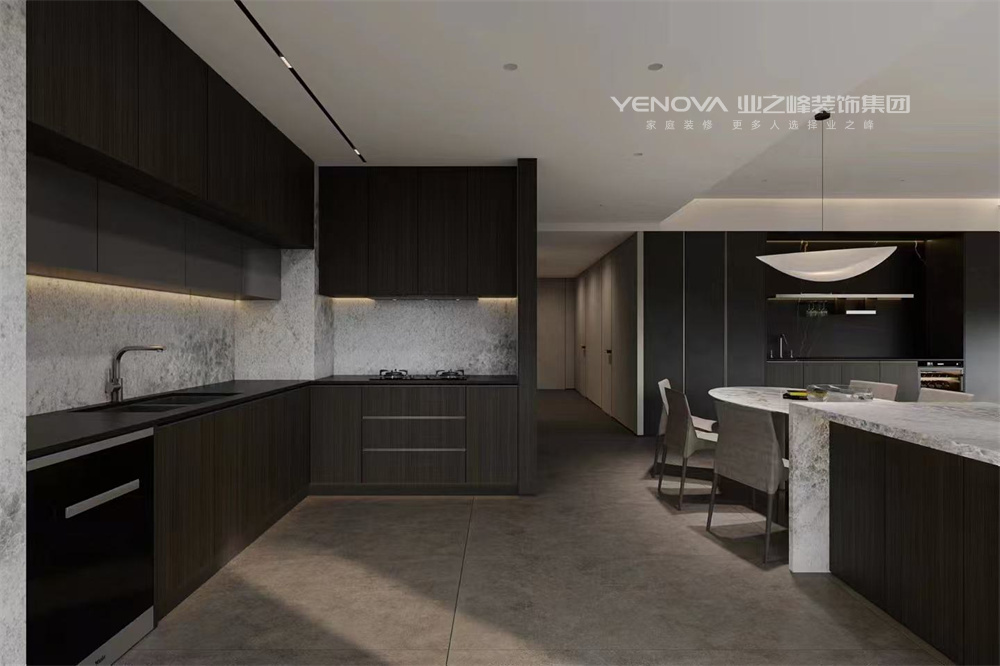 • 材质碰撞:深棕木纹(暖调)+石纹肌理(冷调)+哑光黑(质感),避免纯黑的压抑,让空间更有层次;