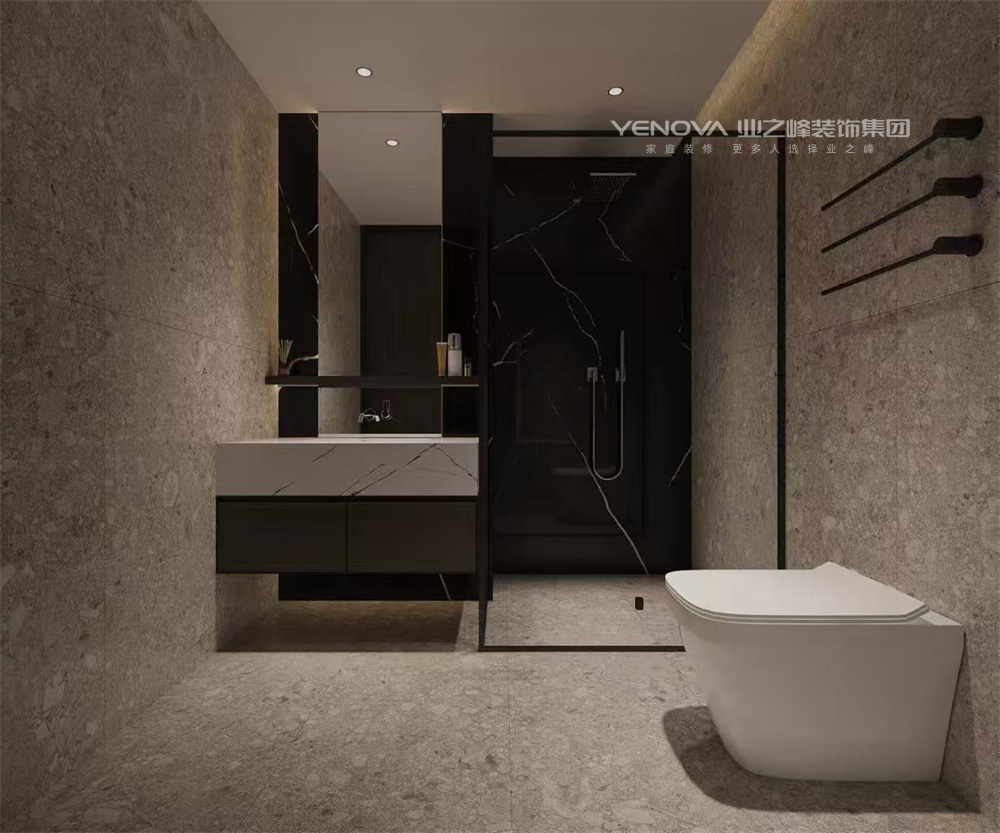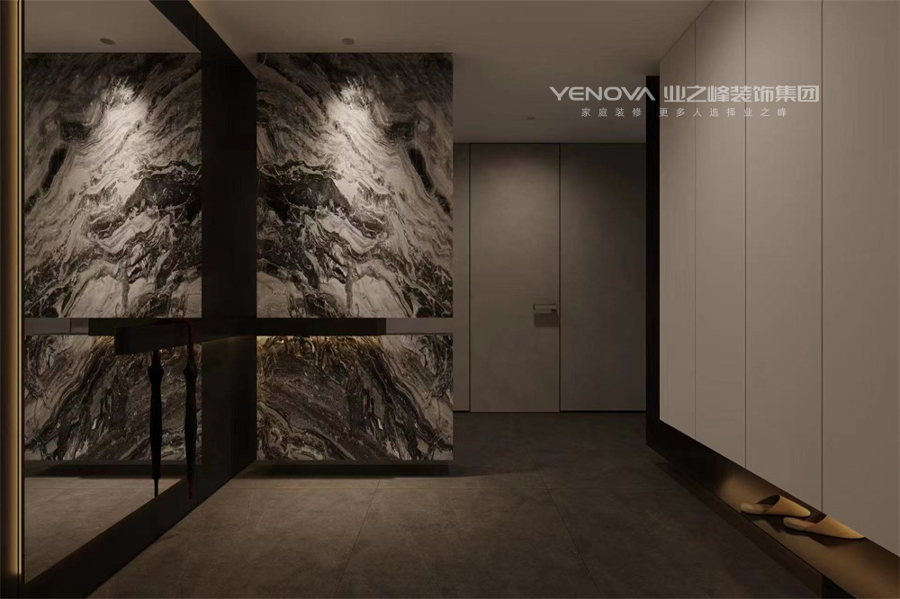 卫浴用石纹瓷砖+智能卫浴(恒温花洒、感应灯),兼顾暗黑质感与适老实用;玄关定制通顶鞋柜+换鞋凳,配合感应灯带,既符合暗黑美学的“隐形式收纳”,又方便母亲日常使用。