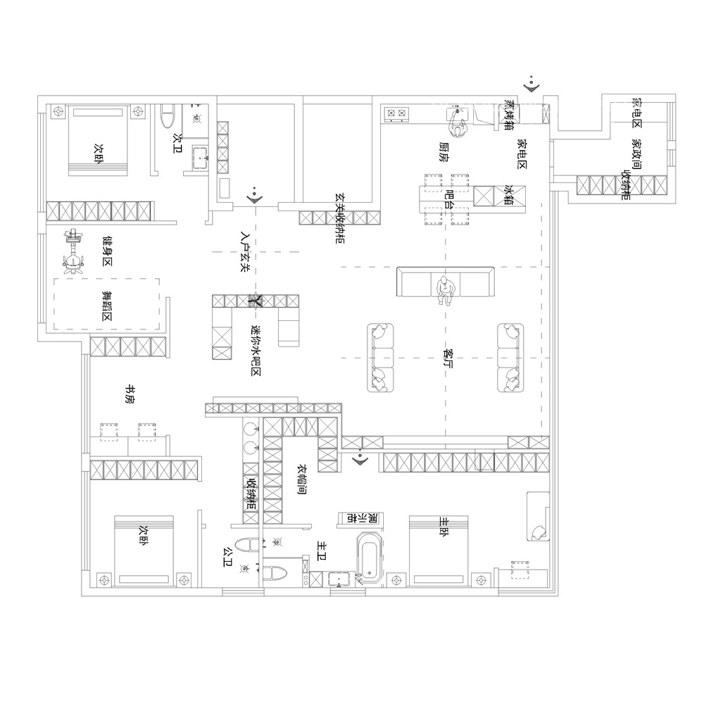 项目背景:业主是95后的年轻夫妻,小两口都是时尚达人,需要属于自己的独立健身区,舞蹈室及书房。主卧做套房设计,观景角度要好,还没有小朋友,需要考虑生活上的仪式感。喜欢黑白灰极简风格。