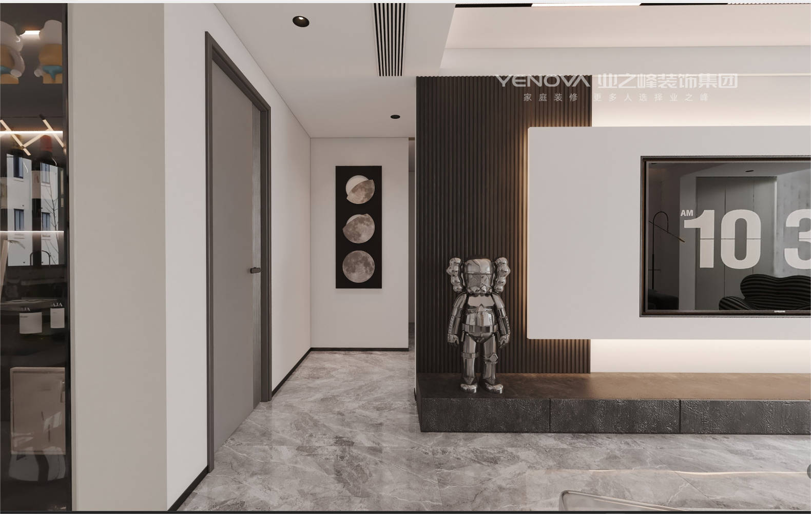 本案旨在打造一个理性、静谧且富有质感的现代居住空间,设计以黑、白、灰为基调。在原始户型中,从入户门进入一眼能看到卫生间,所以客户想要以一个屏风,因此本方案,利用柜子和电视背景墙来做屏风,既满足了客户的要求,也增加了收纳空间。厨房打通了小阳台,让厨房的面积变大。