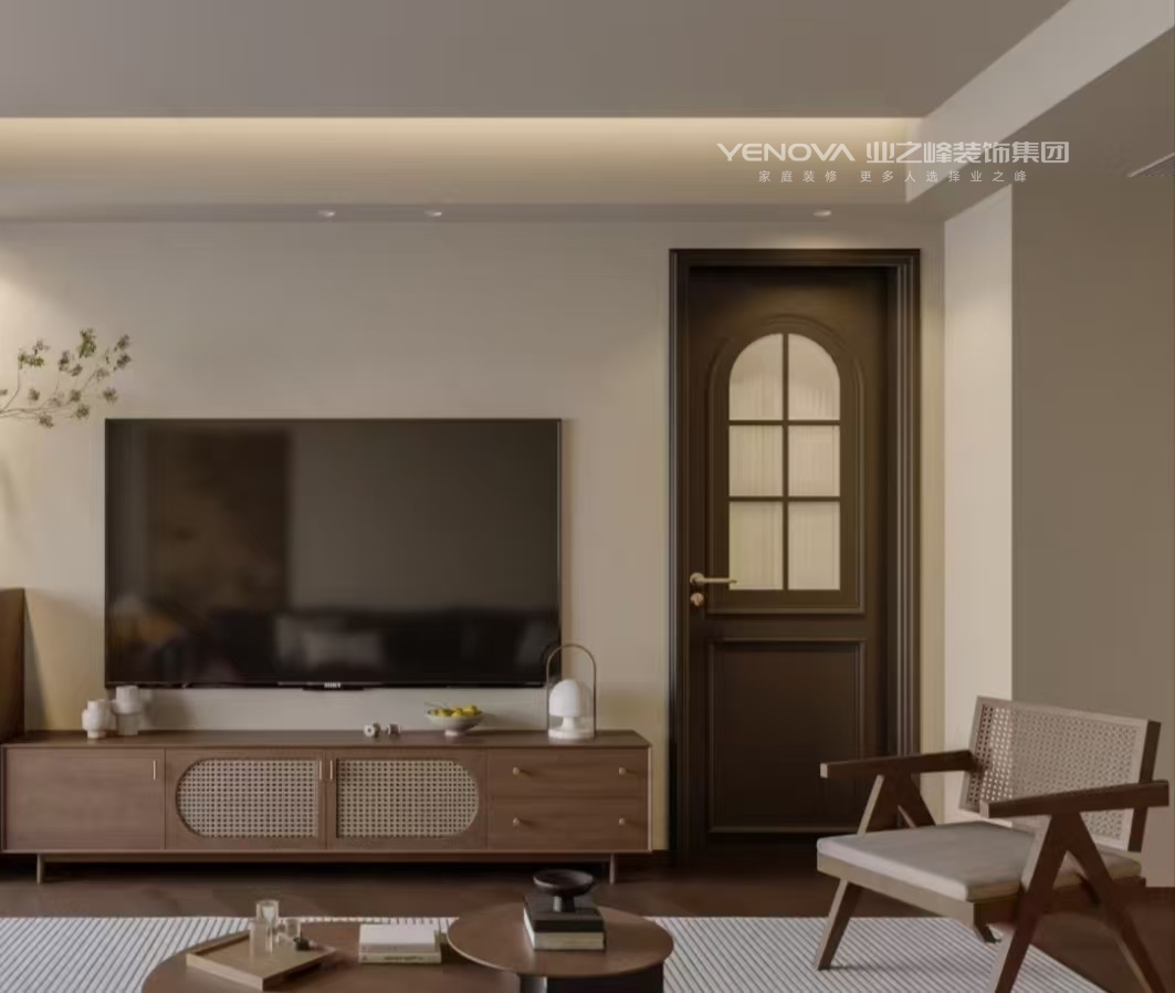 4.在家具选择中,中古风家具“复古质感、温润线条、自然肌理”为核心,从以上核心原则,客厅选用了胡桃木电视柜,搭配藤编椅子既能凸显自然质感,又能增加层次,恰到好处的搭配也不会显得空间杂乱。