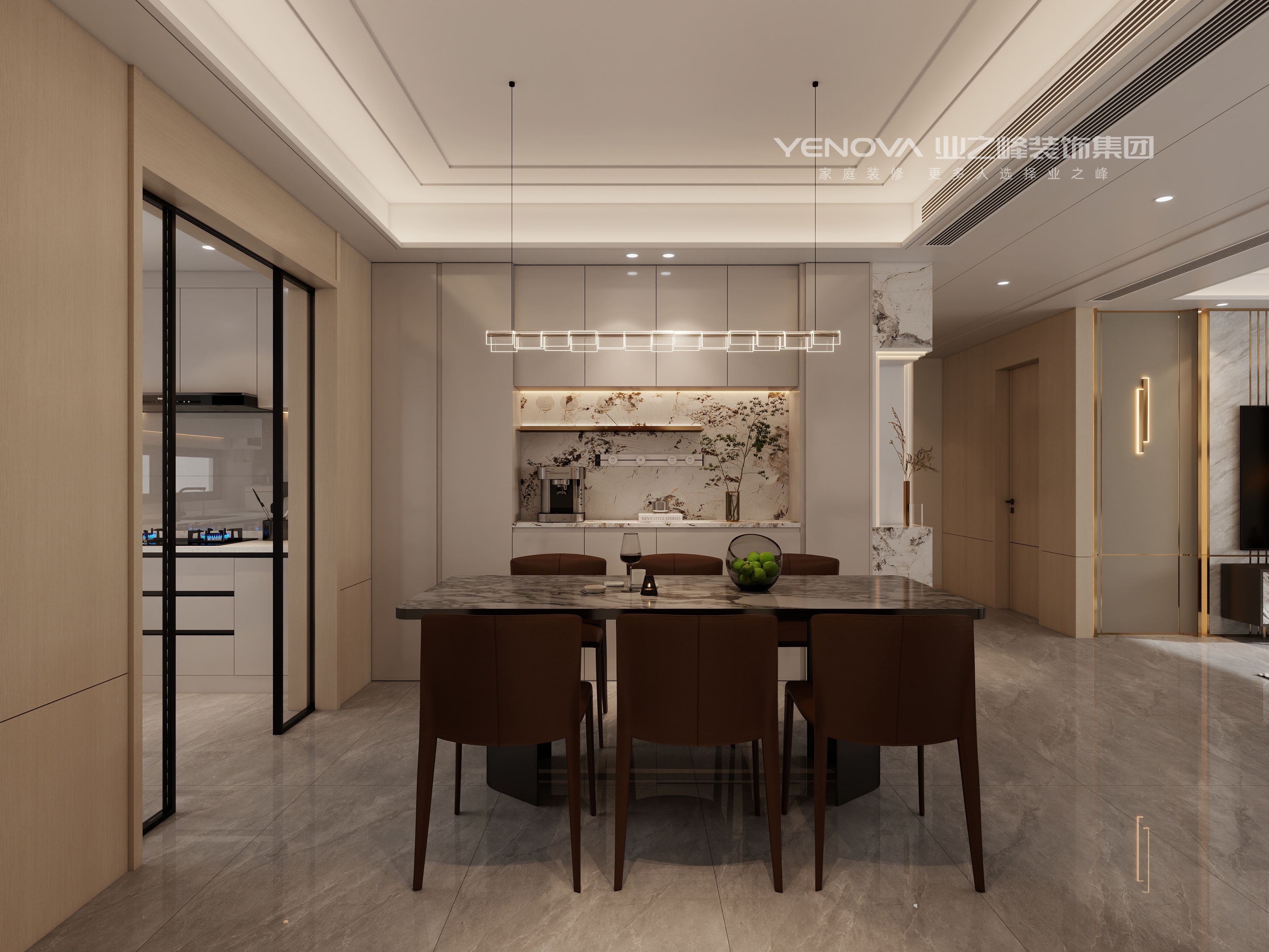 客餐厅采用开放式布局,强化空间通透感。餐厅的大理石餐桌搭配棕色皮质餐椅,轻奢吊灯的几何造型点亮用餐氛围;客厅以大理石电视墙为视觉中心,金属壁灯与皮质休闲椅相互呼应,既满足社交、休闲需求,又通过材质与软装的搭配,处处彰显轻奢品味。
