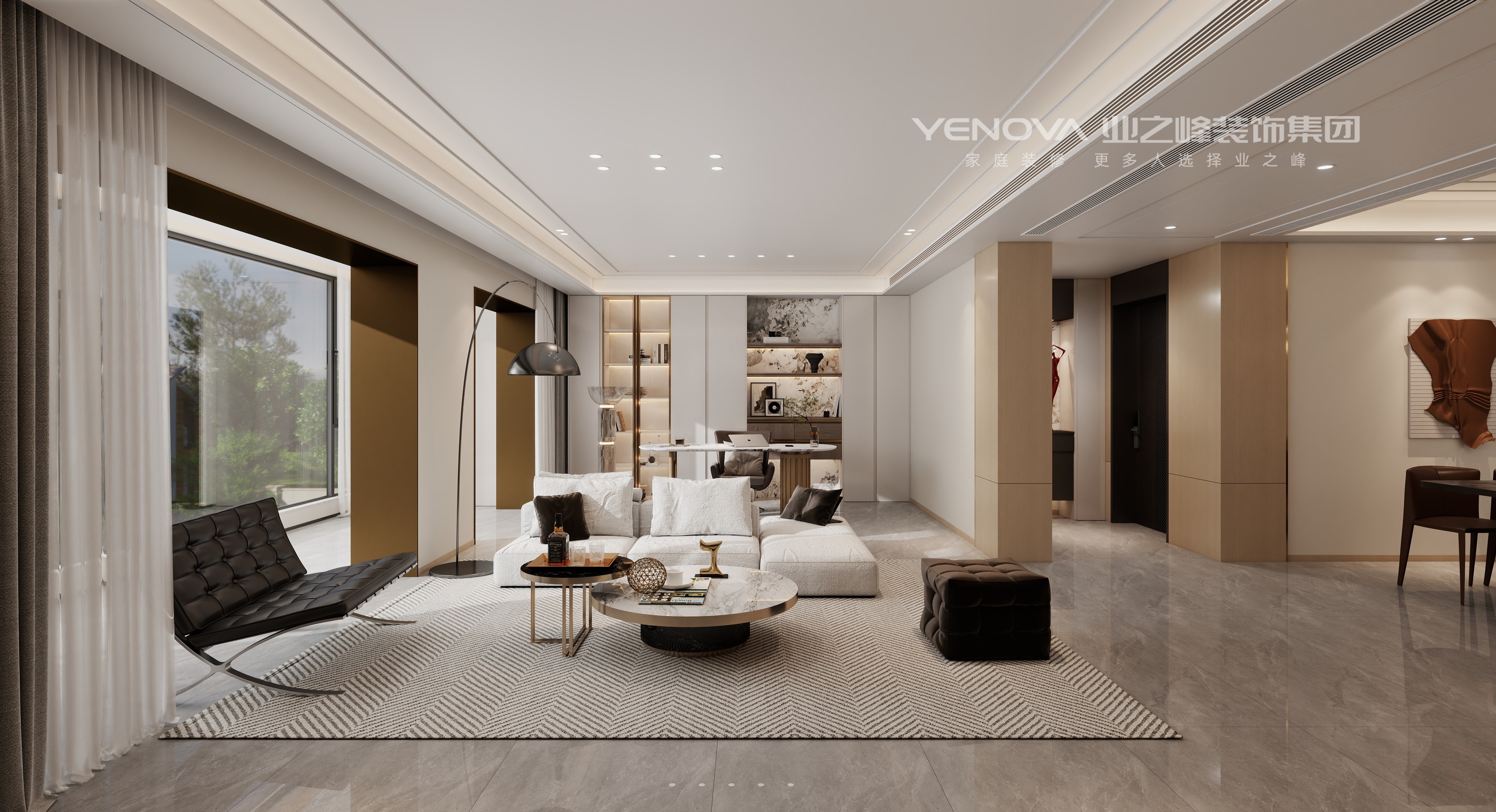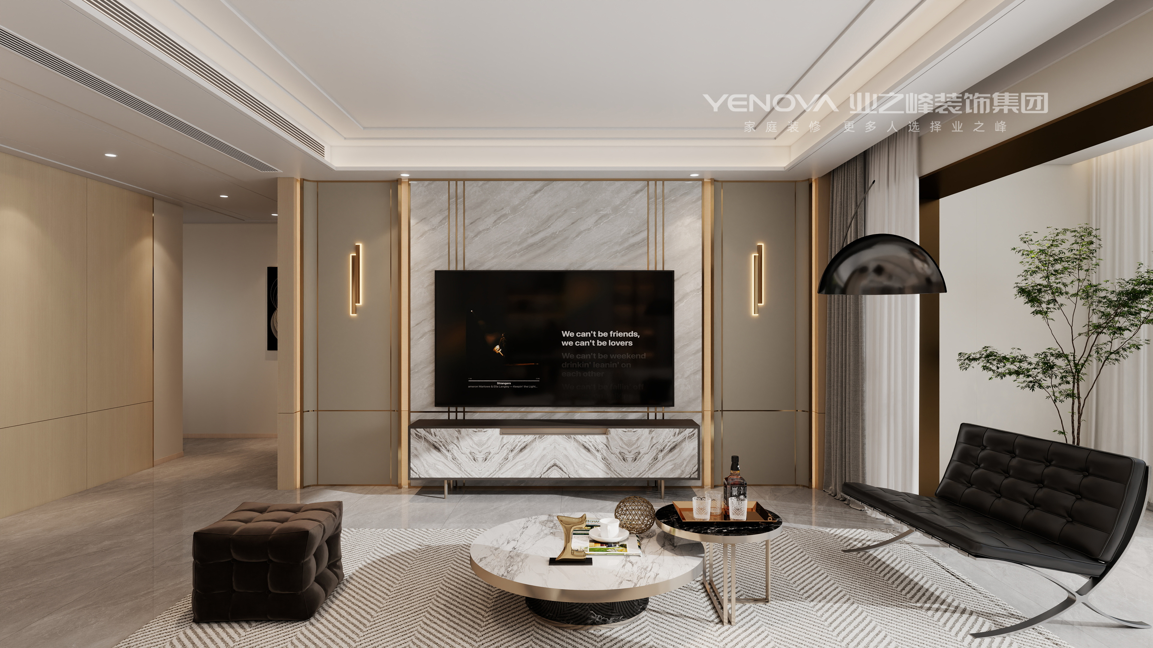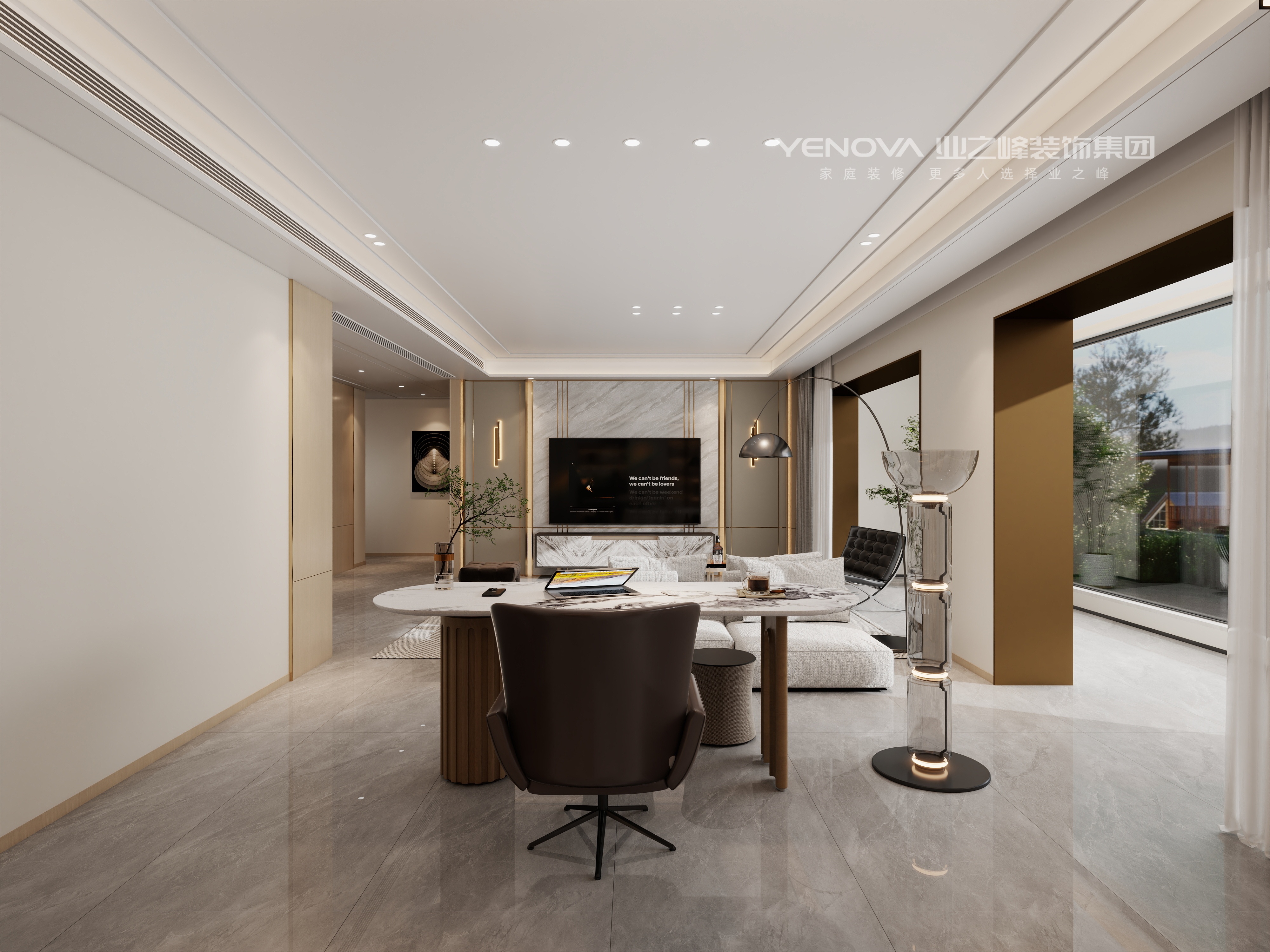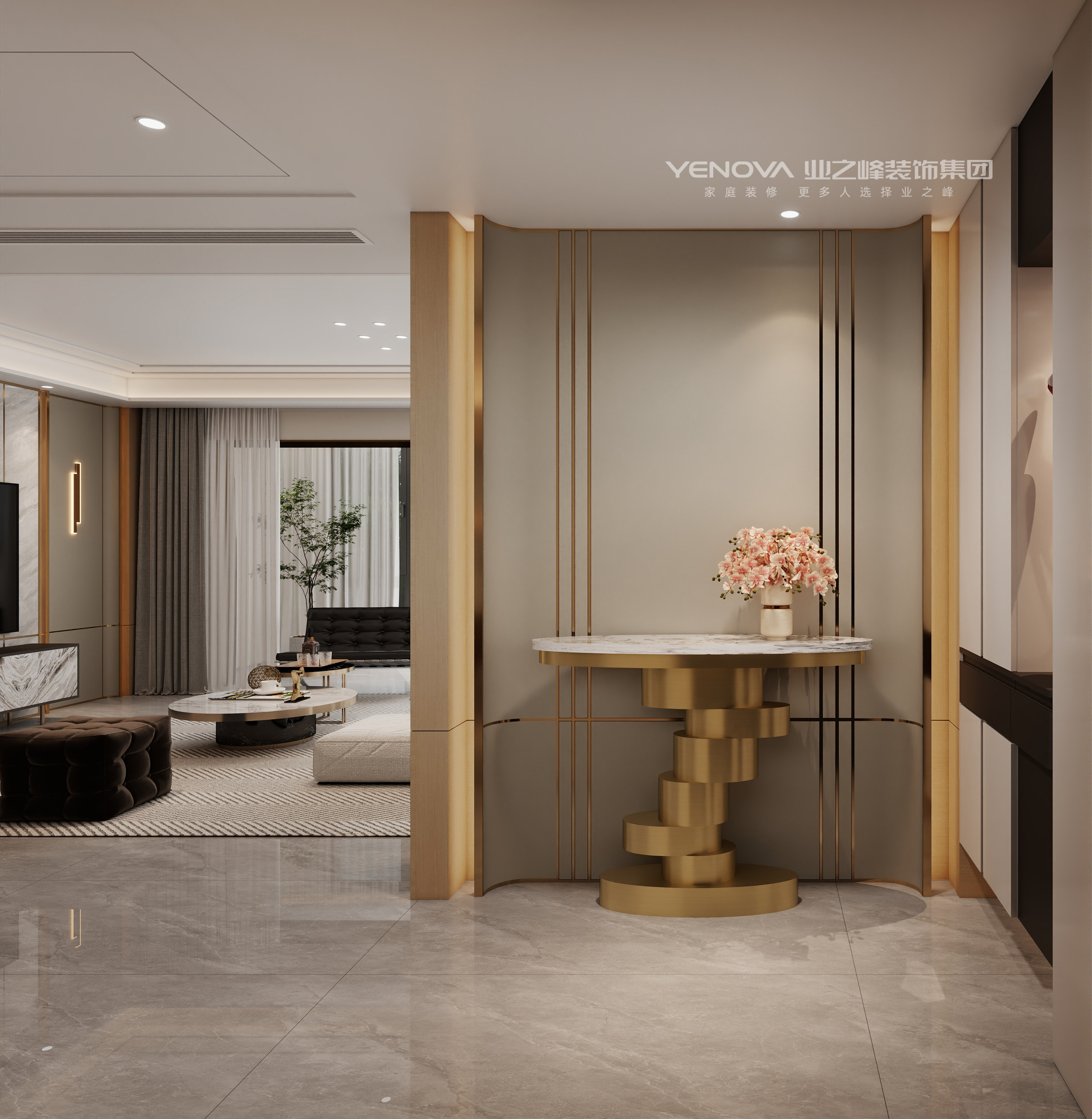 整体色调以低饱和度的米灰,暖棕为主,奠定优雅柔和的空间基调。材质上,大量运用大理石(如客餐厅的大理石餐桌、电视背景墙),其天然的纹理与光泽传递出奢石的尊贵感;金属线条(如玄关、电视墙的铜色装饰条)作为点睛之笔,以冷冽的光泽提升空间精致度;实木板材如卧室、客餐厅的木质饰面)则注入温暖质感,平衡轻奢的冷调,营造出刚柔并济的视觉层次。