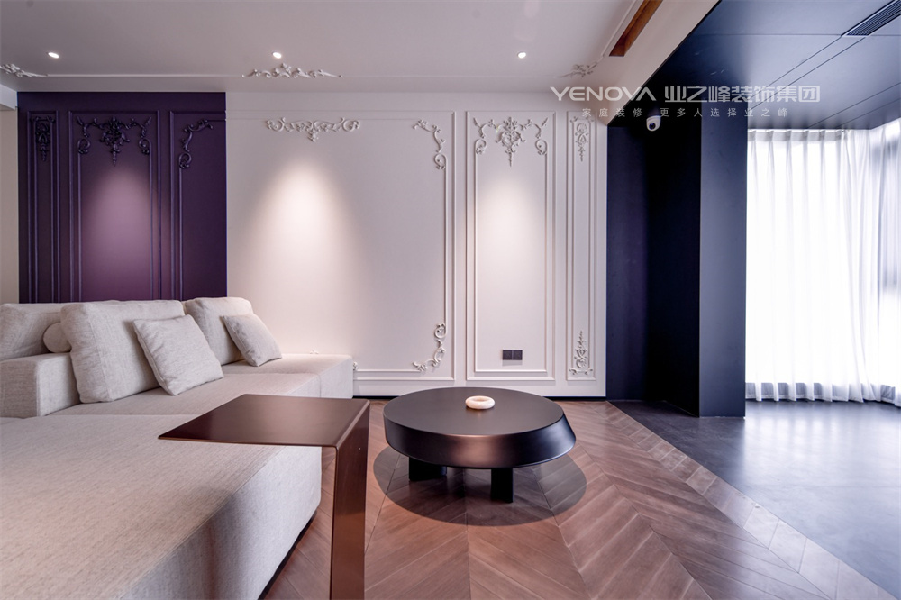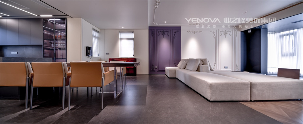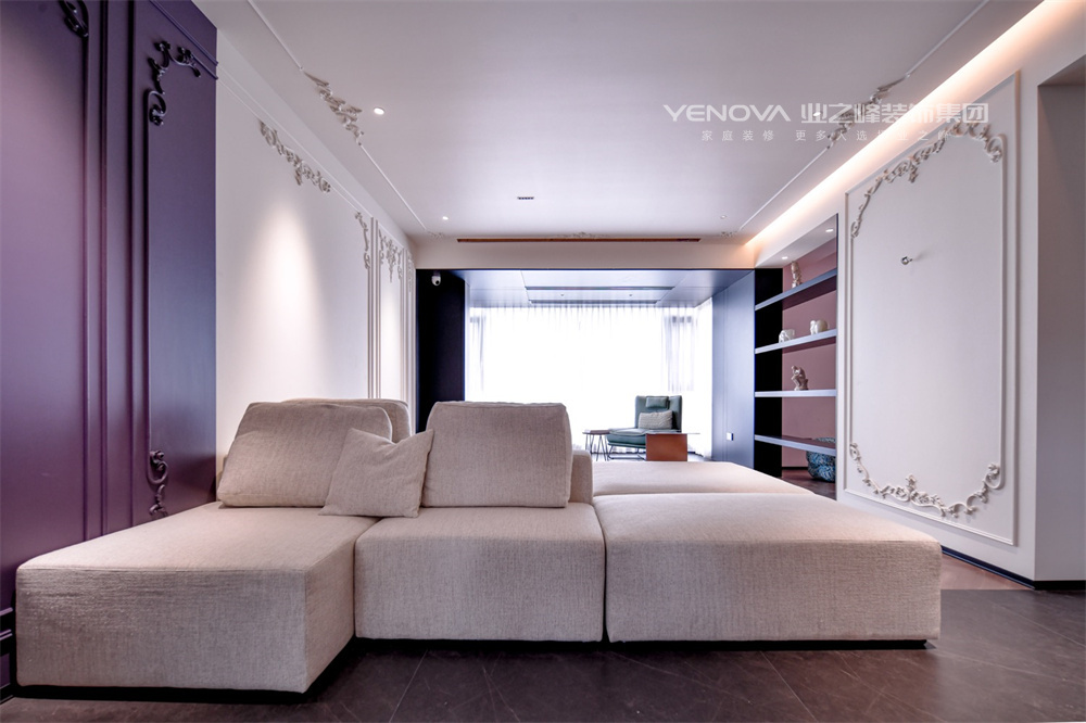 3. 视觉焦点营造:左侧暗紫色墙面+艺术雕塑形成独立展示区,通过局部深色块面打破空间单调性,强化艺术氛围。