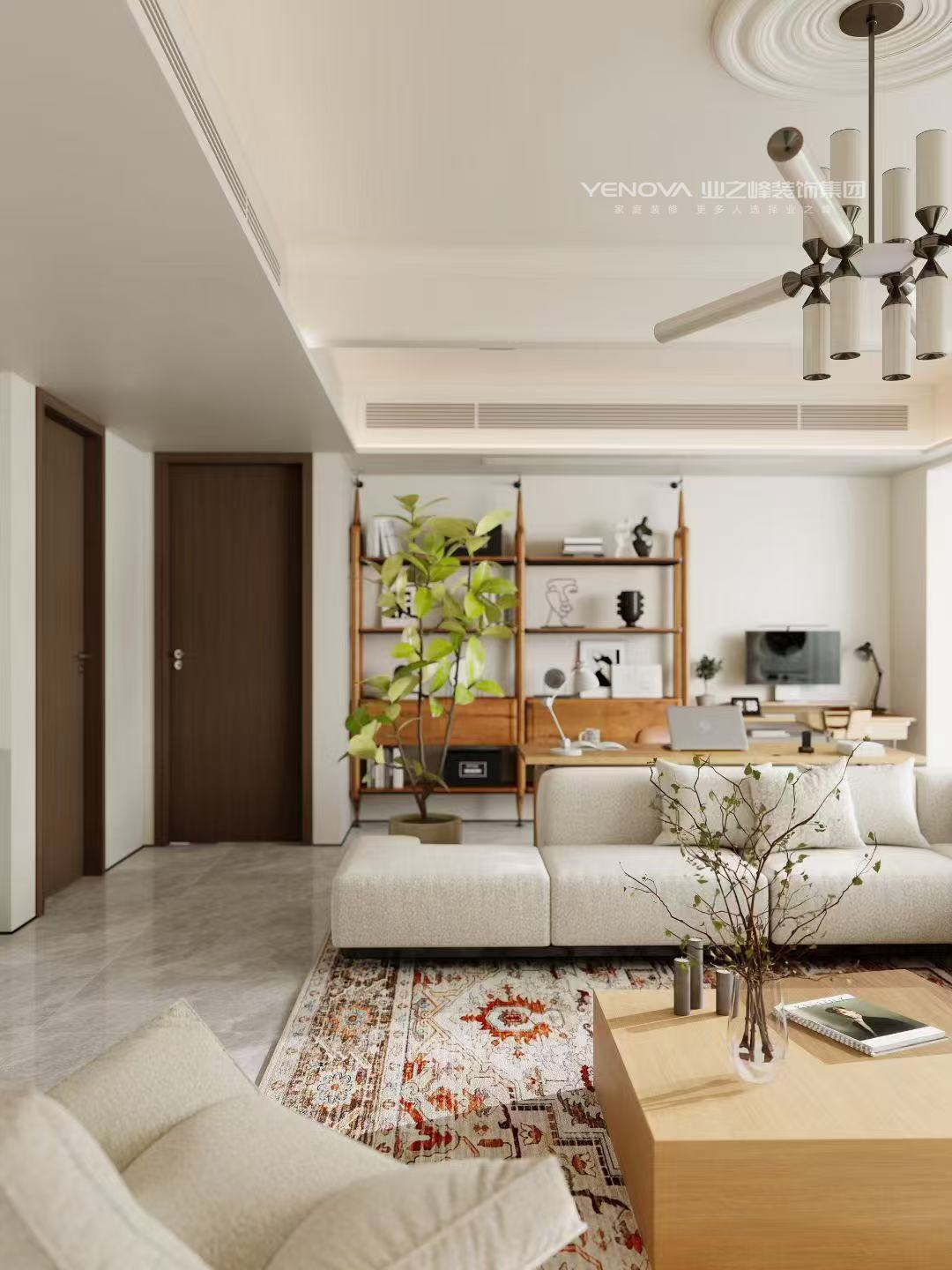 摒弃冗余造型,以极简吊顶+线性风口提升整洁度;软装用绿植、枯枝花艺、艺术摆件做轻量点缀,复古花纹地毯则为空间注入柔和烟火气,让舒适感与呼吸感并存。