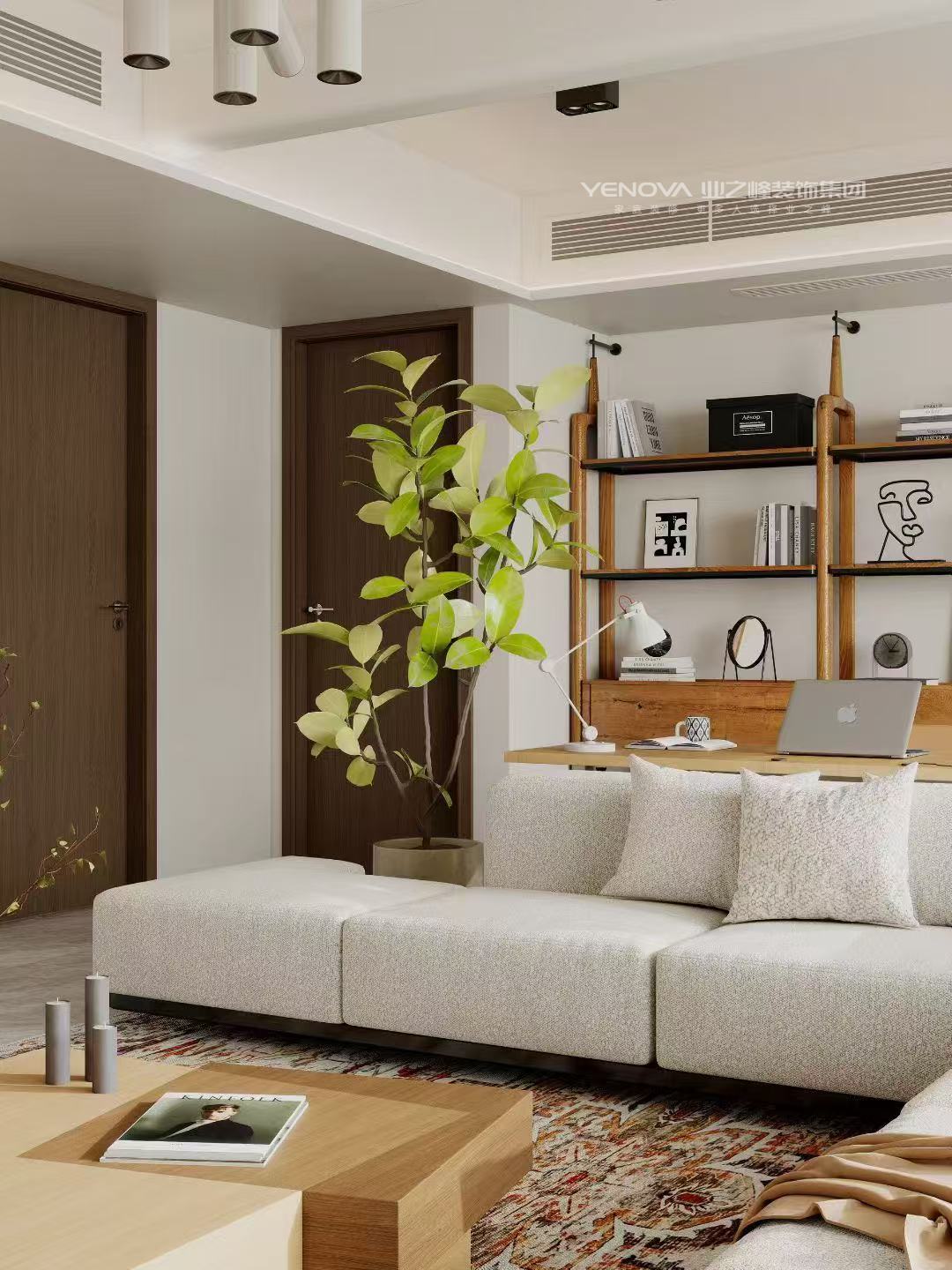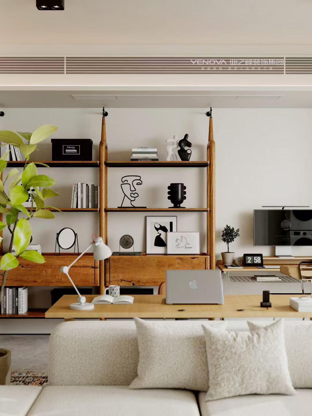 客厅与工作区做开放式衔接,置物架兼作展示与收纳(书籍、装饰摆件分区摆放),沙发+单椅组合兼顾休闲与待客,既满足日常起居,也适配临时办公的弹性需求。