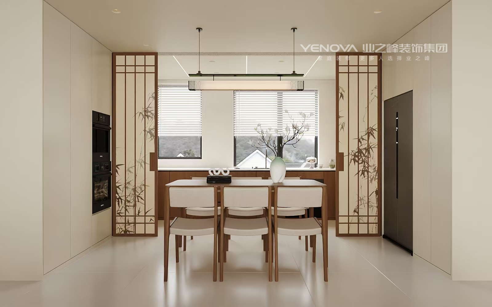 空间布局遵循“通透”原则,采用开放式客餐厅,以博古架做半隔断,保持视野开阔。家具选用线条简练的明式风格,搭配棉麻、丝绸软装,舒适与风雅并存。墙面饰以山水纹壁布与圆形镂空窗棂,体现“天圆地方”的哲学观。