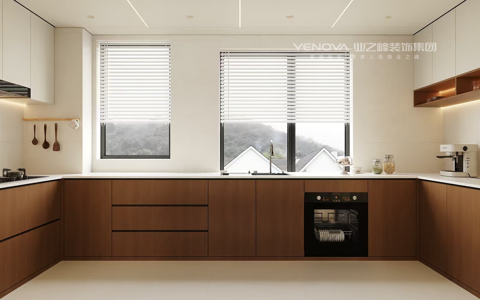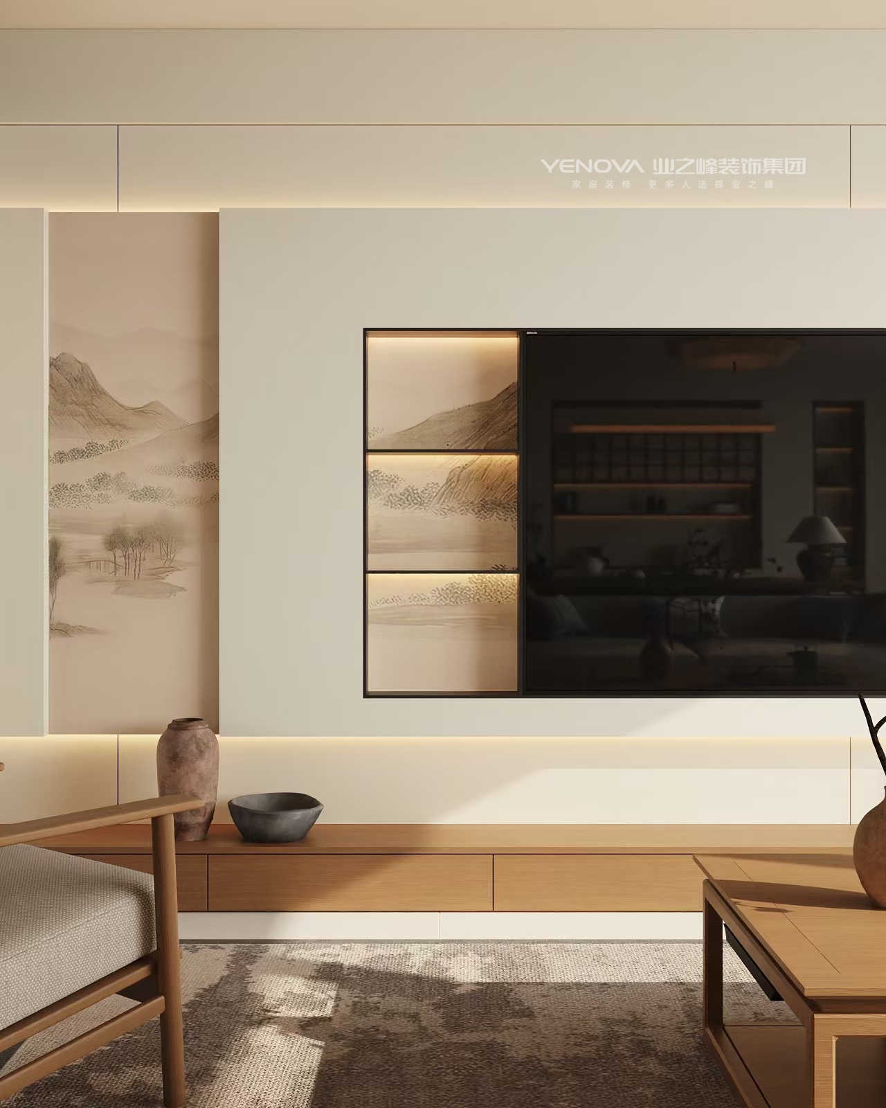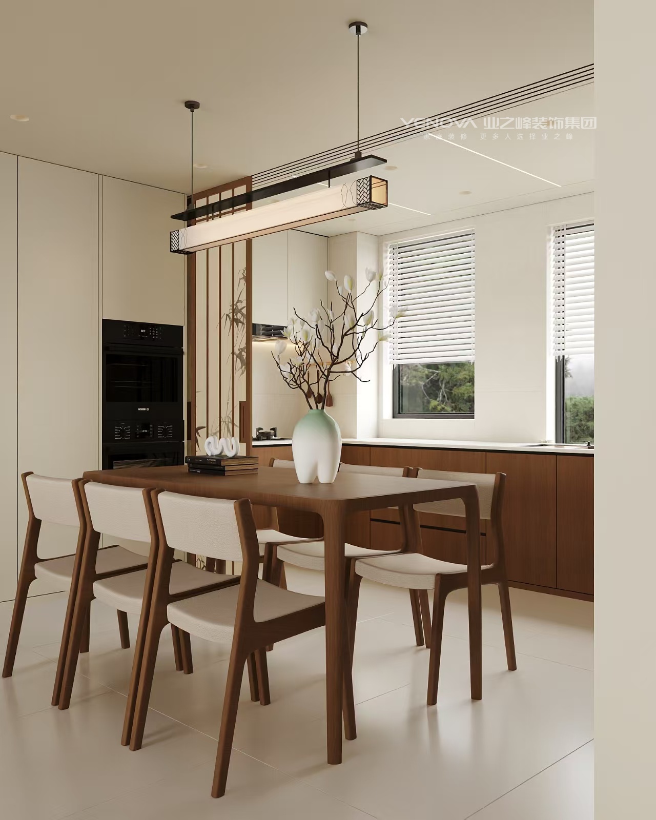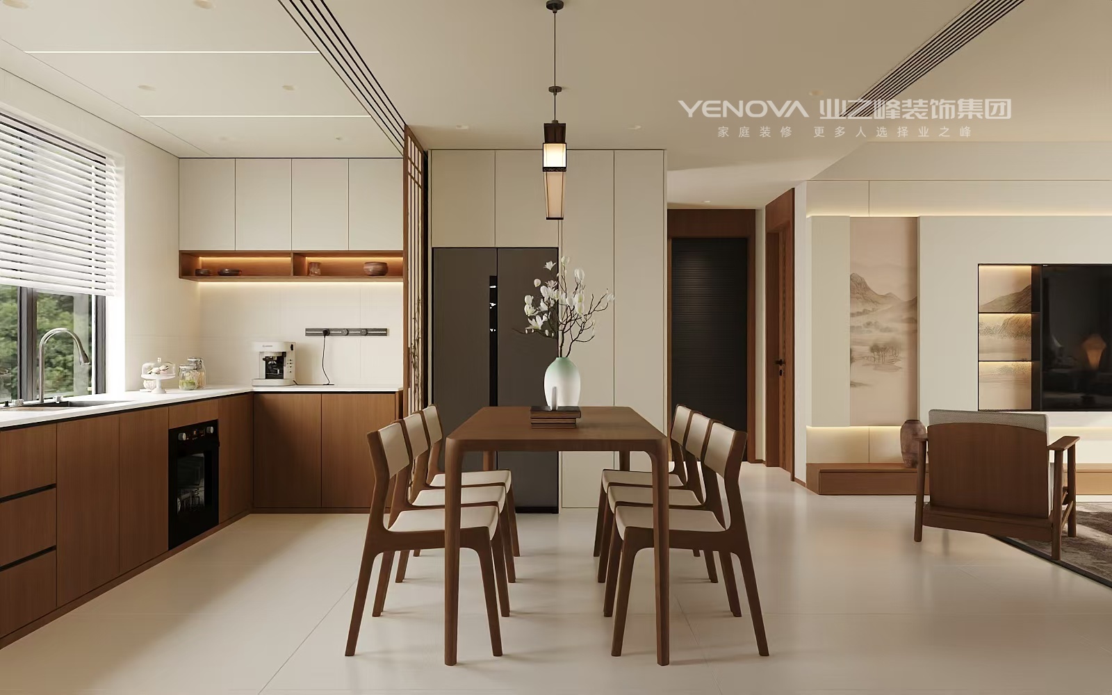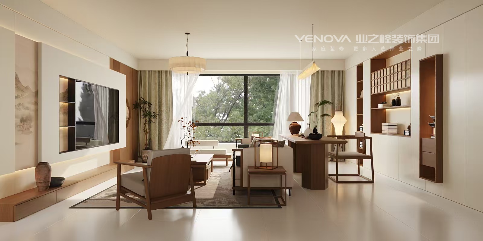 本案为五口之家打造新中式雅居,旨在融合传统意韵与现代生活。整体以胡桃木、浅灰为主调,点缀黛蓝、赭石,营造沉稳宁静的氛围。