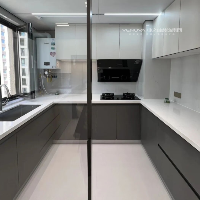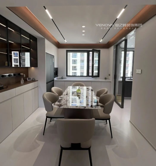 当现代轻奢邂逅130平型,在红星天铂2期便有了这样一处质感居所。餐边柜融合黑玻展示区与木色操作台面,暗藏灯带点亮精致感;另一侧开放式厨房以灰白带纹理的橱柜为主,搭配黑色烟机灶具,简洁大气。