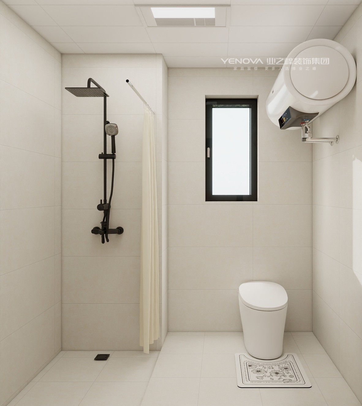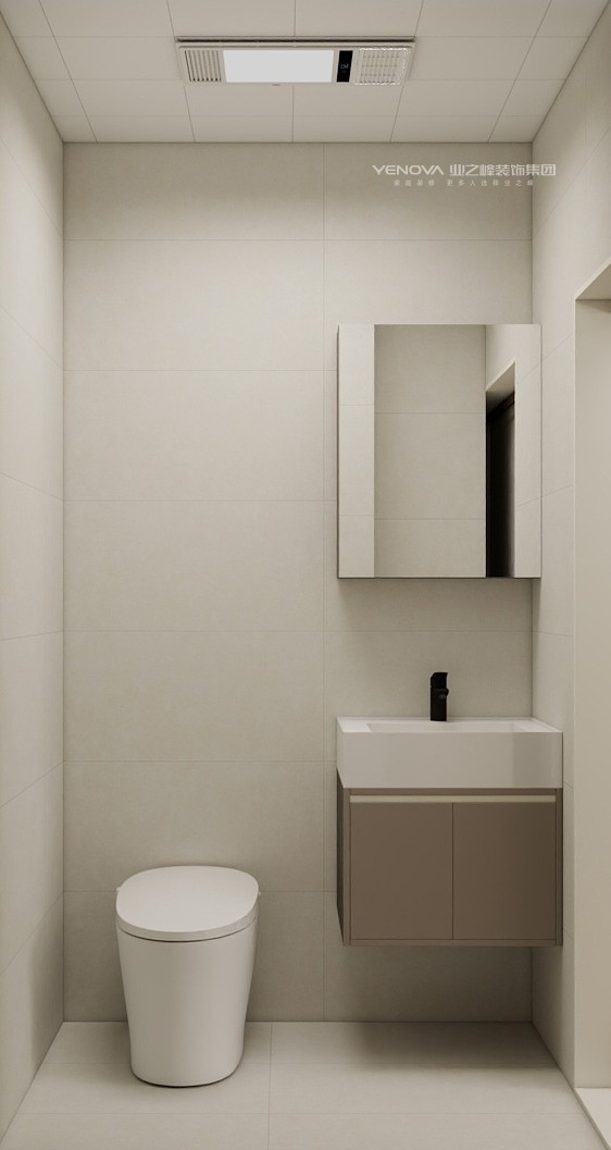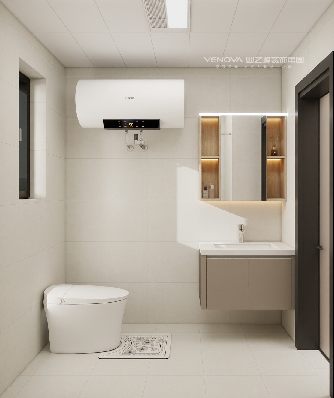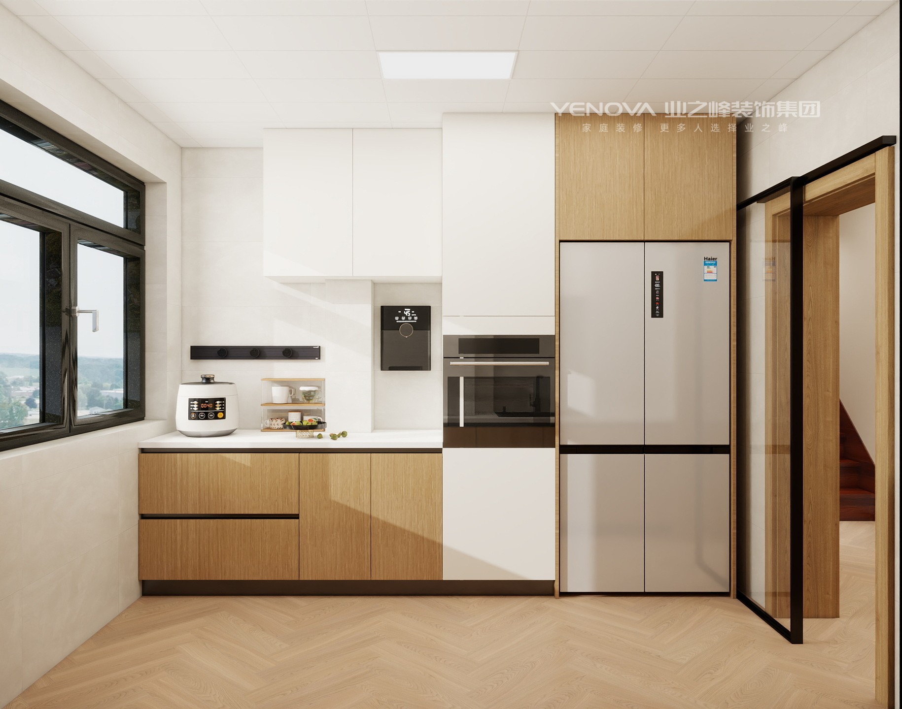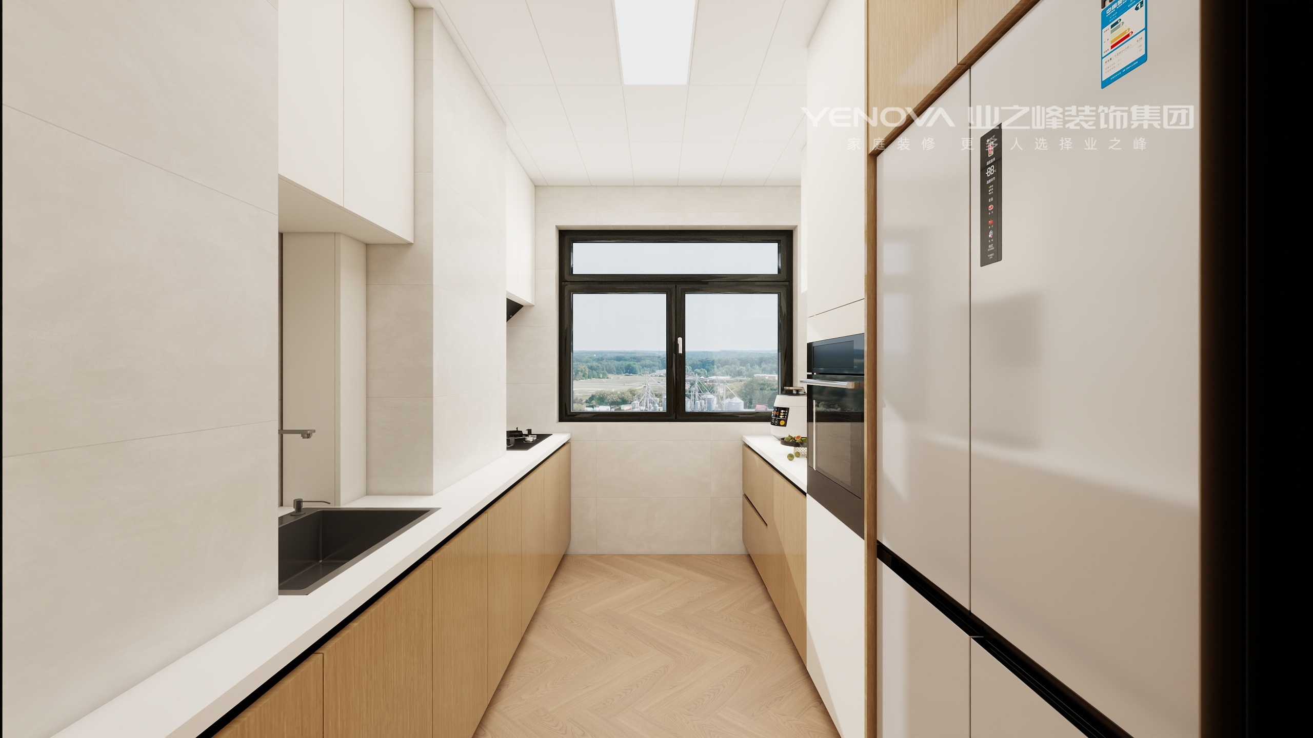 厨房采用功能化布局,原木柜体与白色台面碰撞出清爽感,大窗设计引入充足采光,嵌入式电器与定制收纳柜让操作与储物井然有序。卫生间以简约线条营造整洁感,智能马桶的配置提升品质体验。