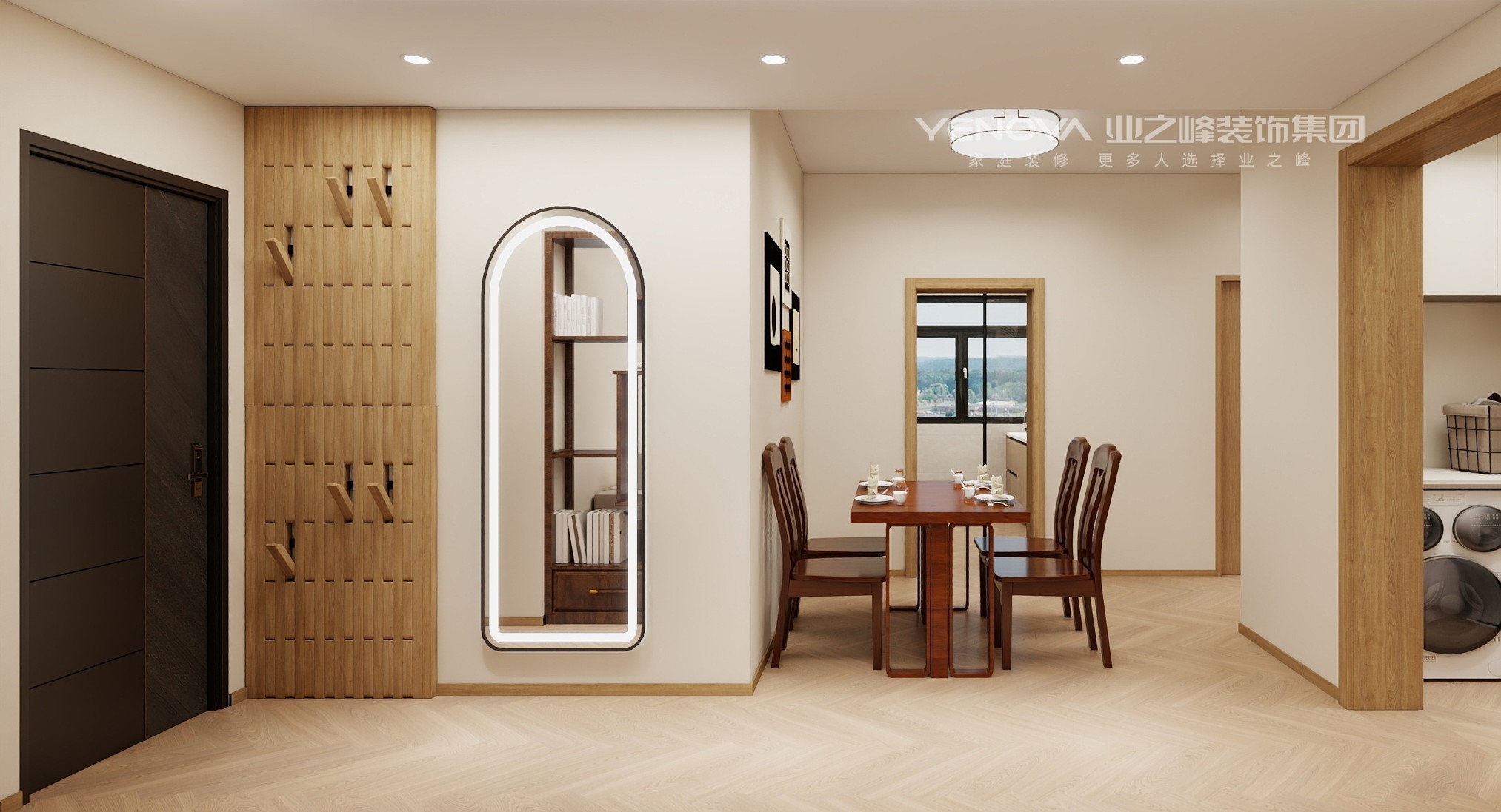 玄关木质格栅挂衣区与拱形镜的组合,既解决入户收纳,又成为视觉焦点。