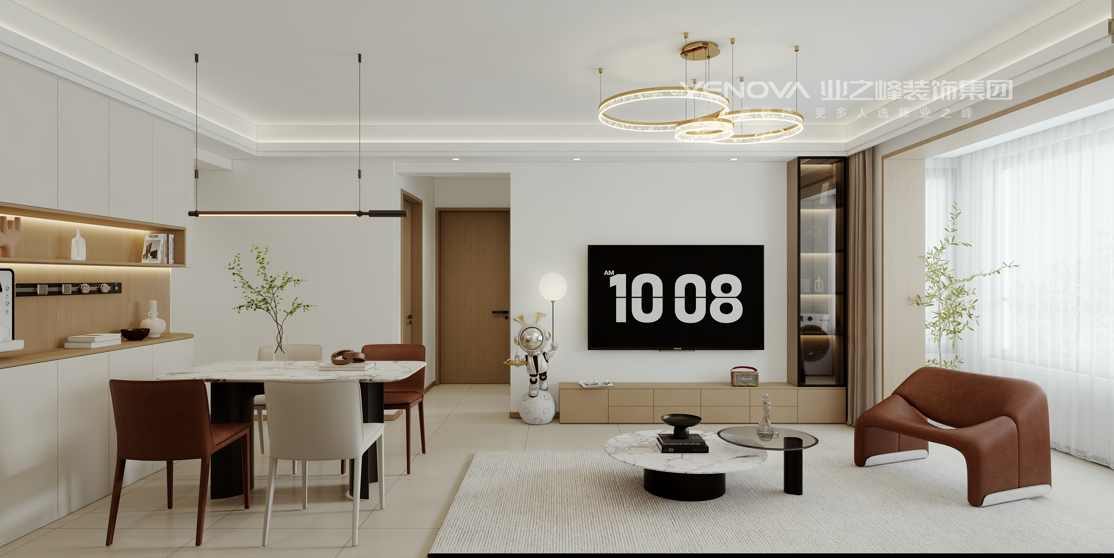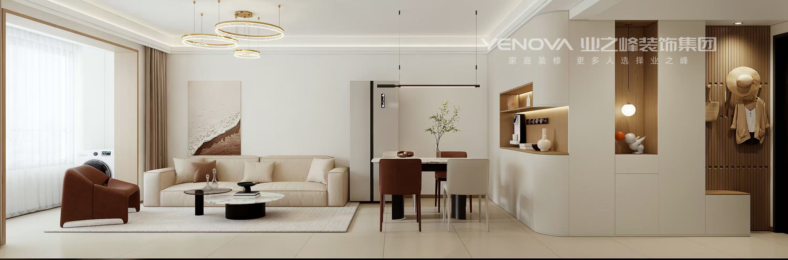 天和苑 95 平现代简约设计,以浅白衬木色柔化质感,通联动线 + 隐形收纳提效,轻简软装衬出温馨实用的起居空间。