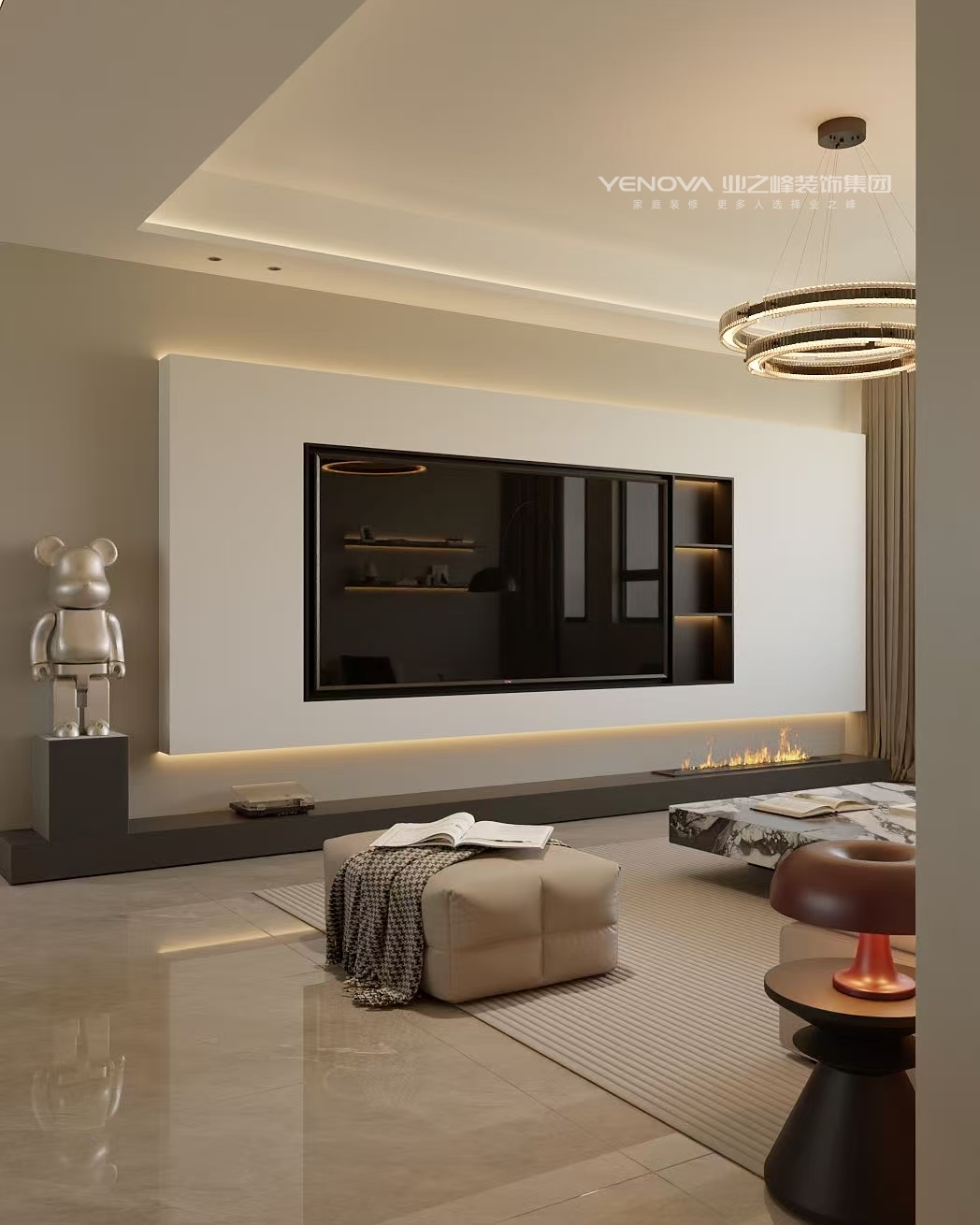 色彩搭配:以中性色(米白、浅灰、裸色)为主调,奠定简洁大气的基调,再通过少量深色(如棕色抱枕、红色台灯)和金属色(灯具、摆件)作为点缀,提升空间质感与活力。