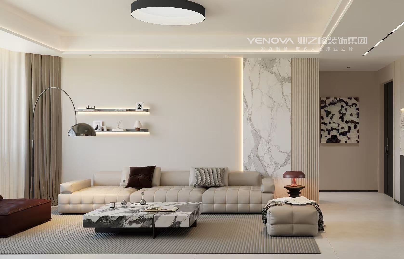 家具与软装:家具造型简约大方,如模块化的皮质沙发、几何感的大理石茶几,功能与美观兼具;软装陈设克制且精致,墙面的层架、艺术画、造型独特的灯具(弧形落地灯、圆形顶灯、复古台灯),既满足实用需求,又强化了风格的艺术氛围,整体营造出舒适、时尚且富有格调的居住空间。