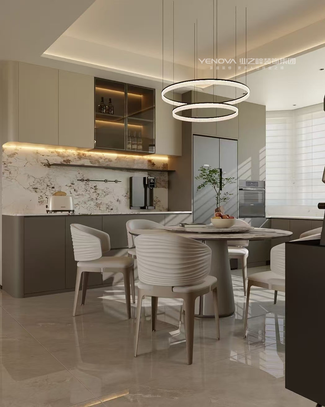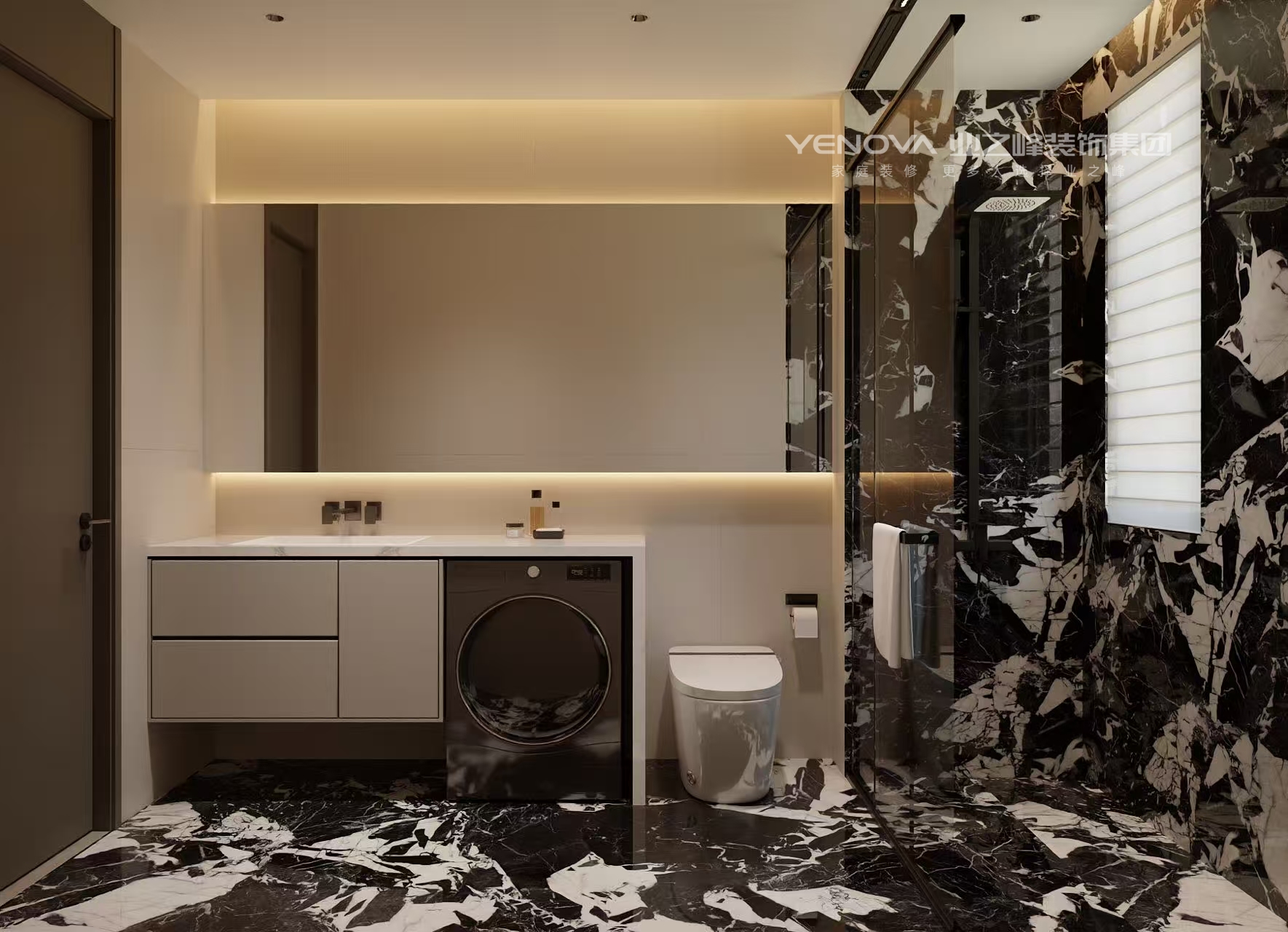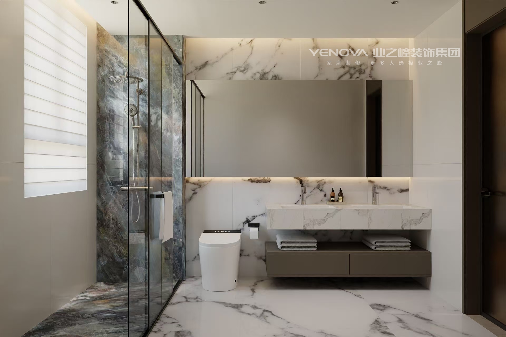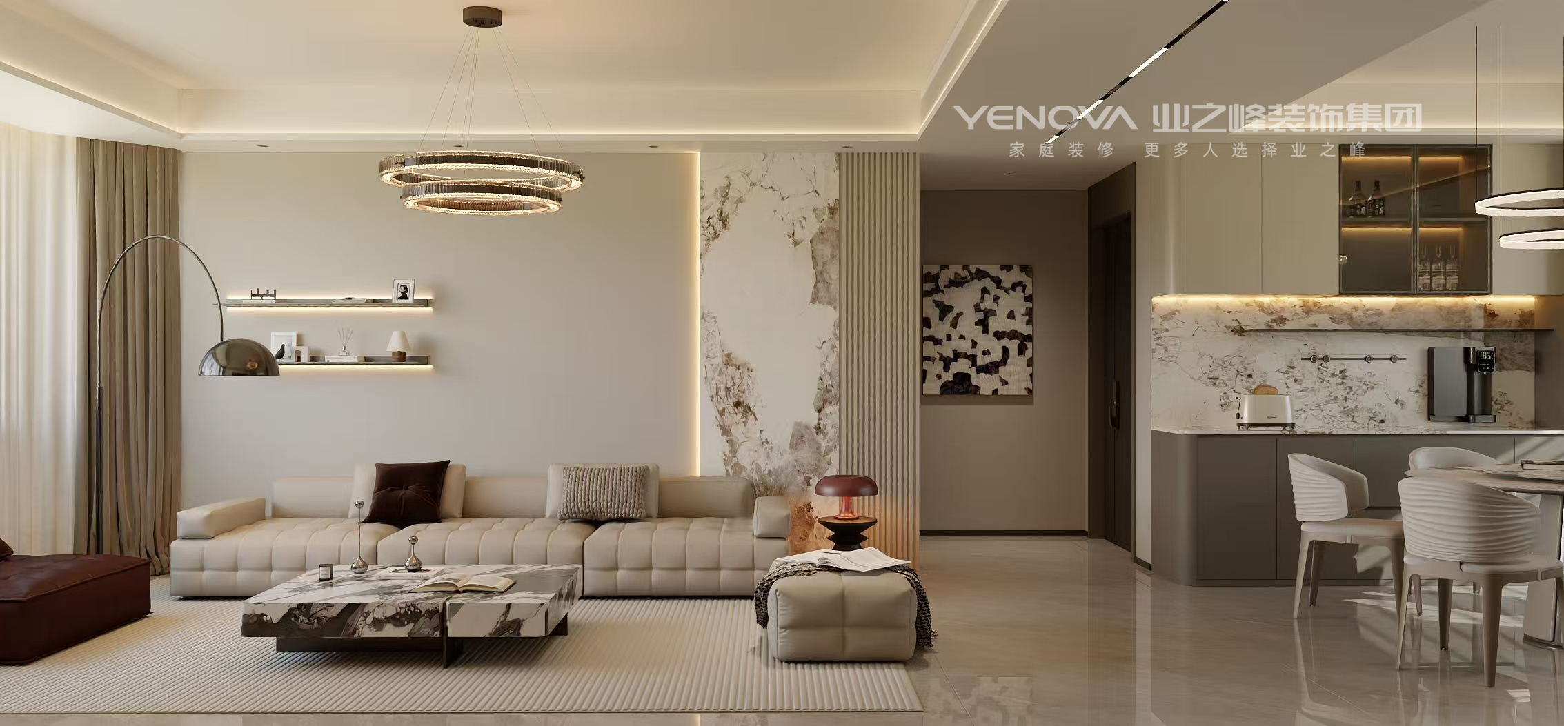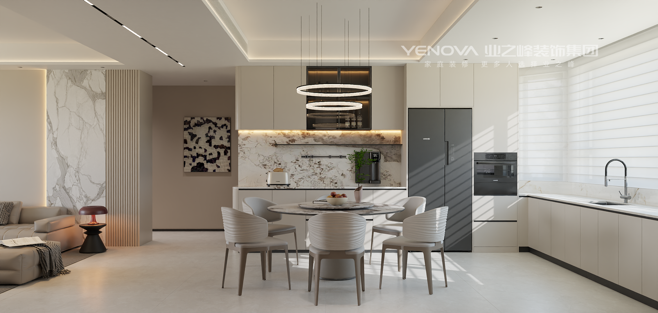 空间布局:强调开阔通透,无过多冗余的隔断,利用线条和材质的区分营造层次,通过大理石墙面、竖向格栅与其他区域自然划分,同时保持视觉上的连贯。