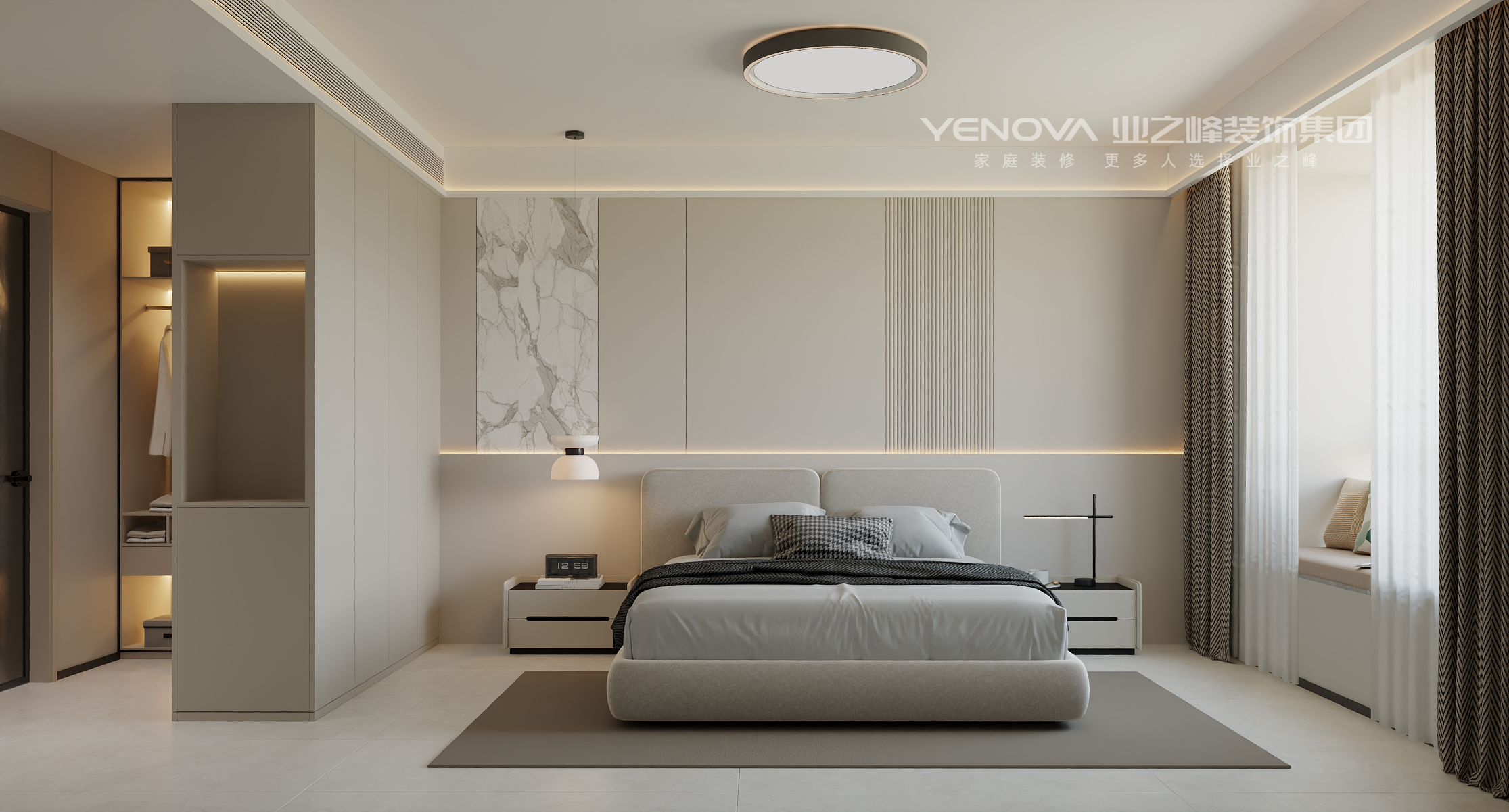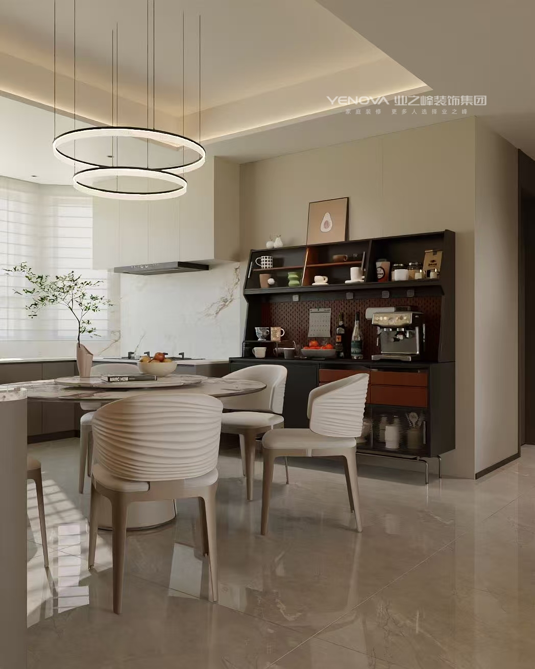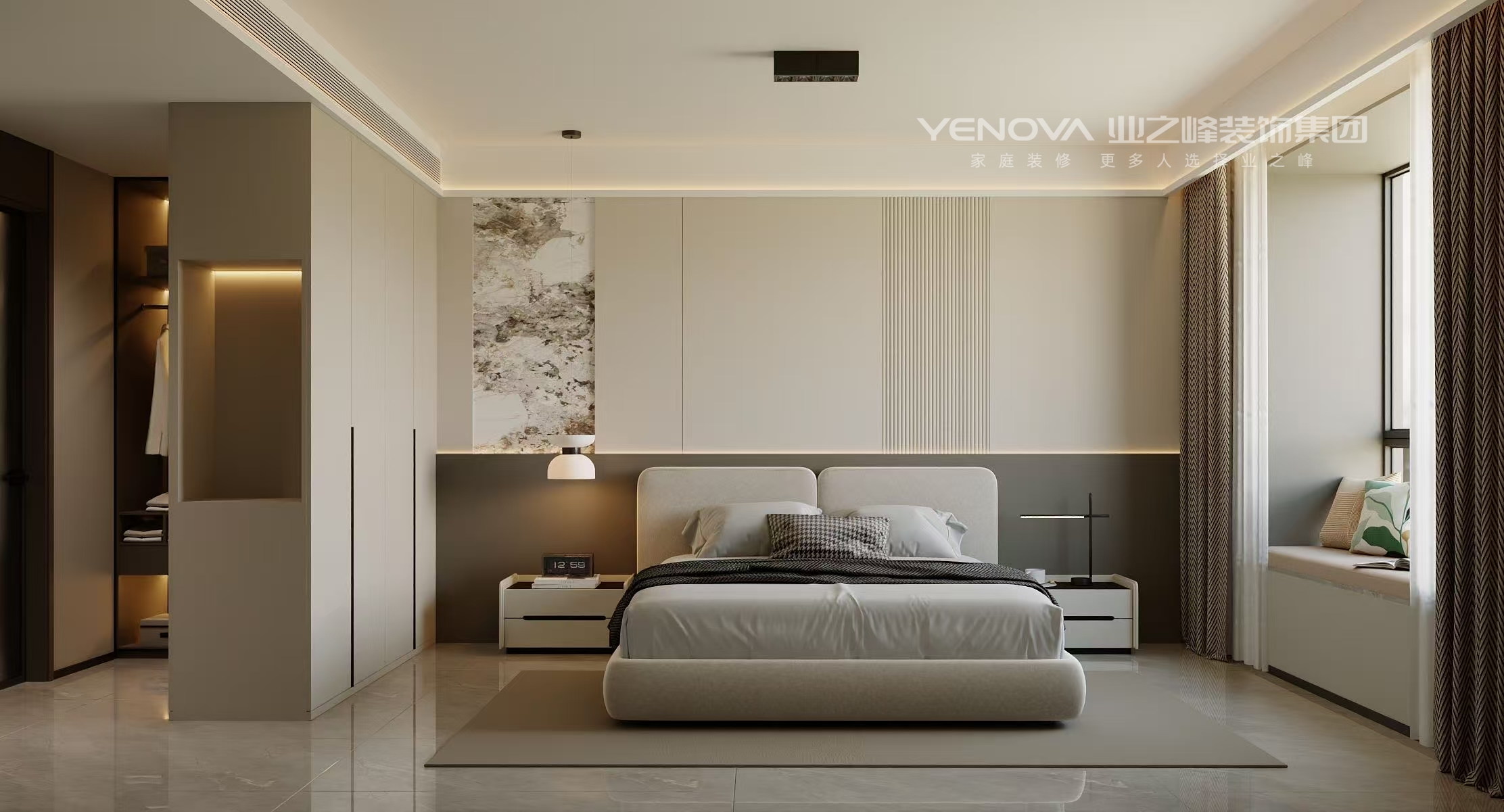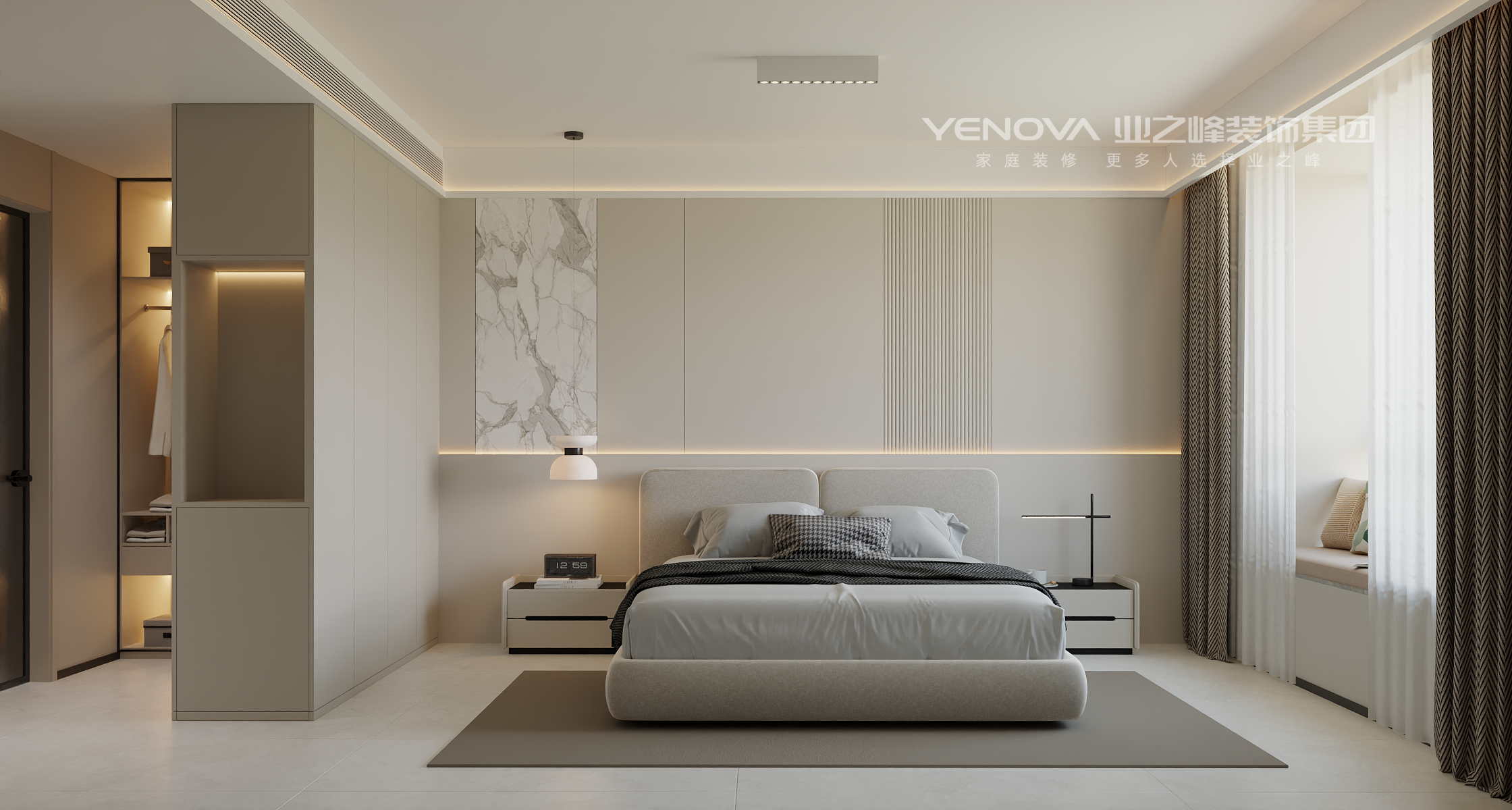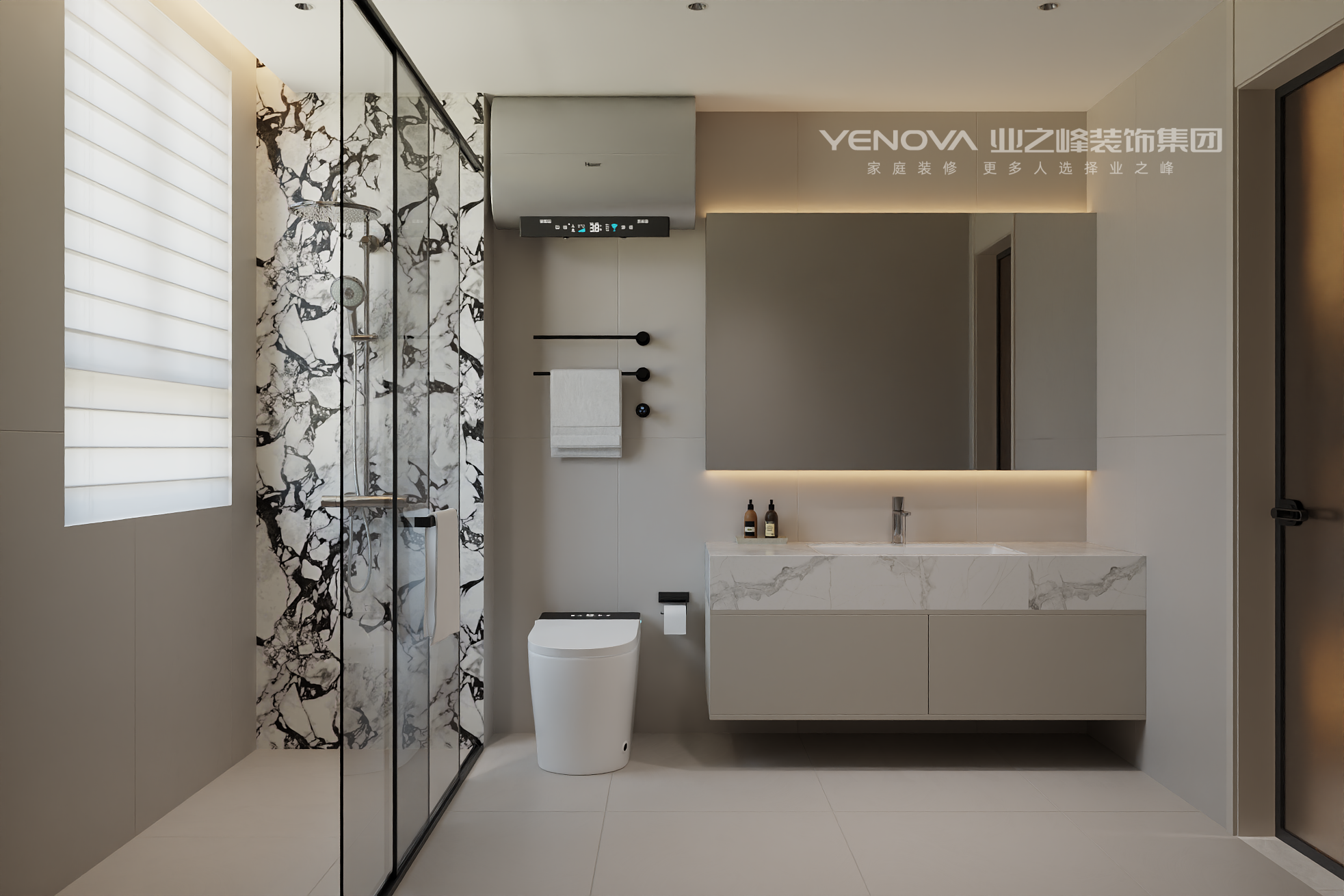 空间布局:强调开阔通透,无过多冗余的隔断,利用线条和材质的区分营造层次,通过大理石墙面、竖向格栅与其他区域自然划分,同时保持视觉上的连贯。