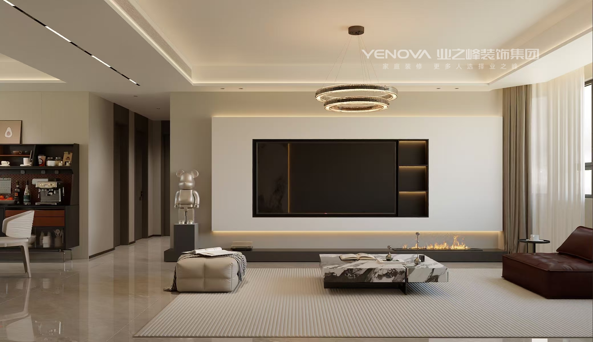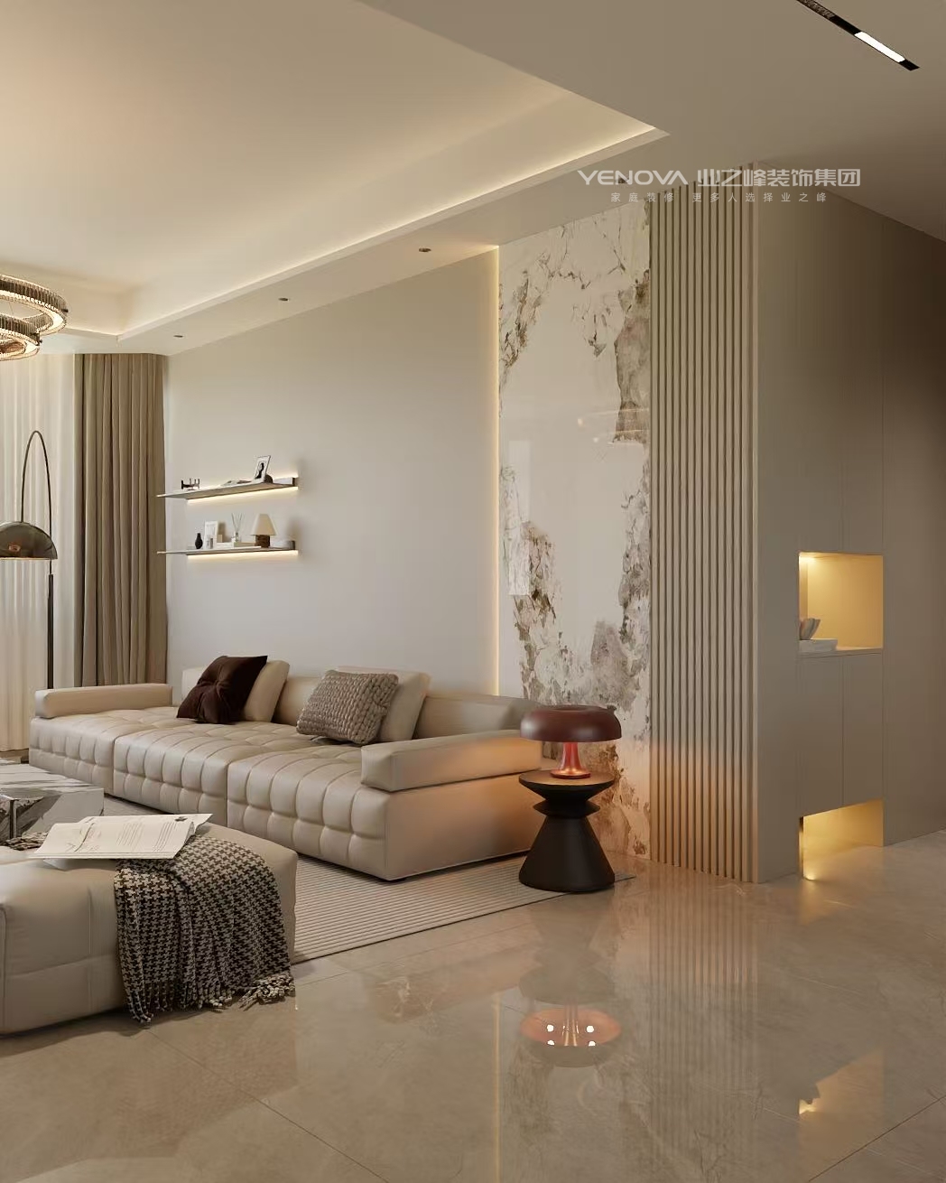 材质运用:融合多种质感的材质,如皮质沙发的柔软、大理石的冷冽精致、格栅的肌理感、地毯的温暖,丰富触觉与视觉体验,同时体现精致感。