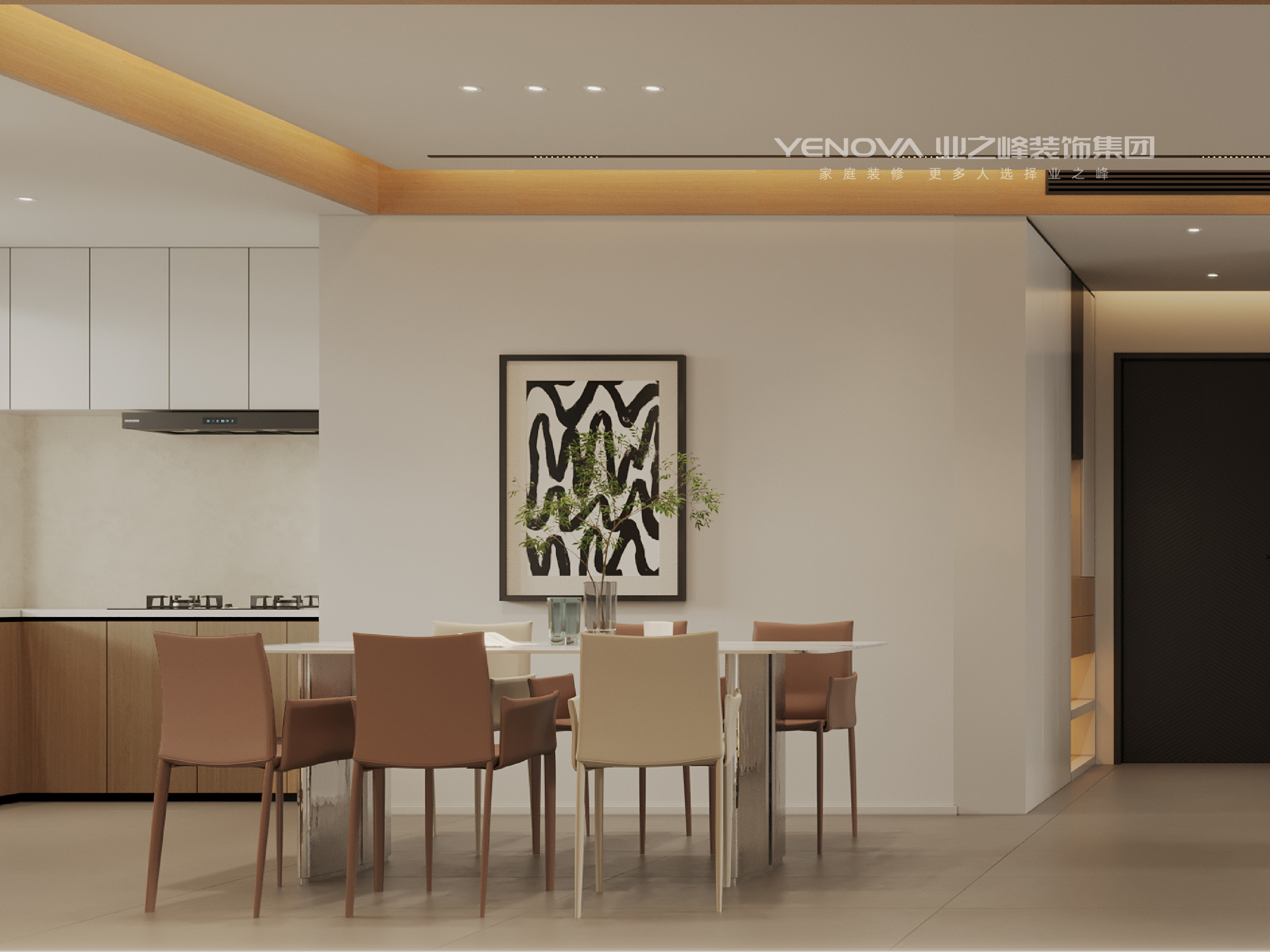 客餐厅:开放式布局 + 无主灯设计,顶面木质线条、大理石纹装饰墙等材质对比,搭配简约皮质沙发、金属质感家具,辅以艺术挂画、局部灯光,既显简约通透,又藏轻奢质感。