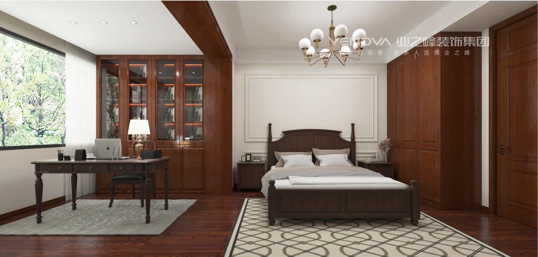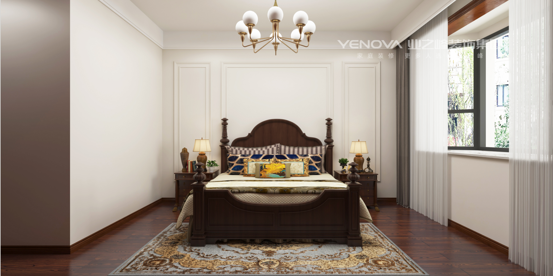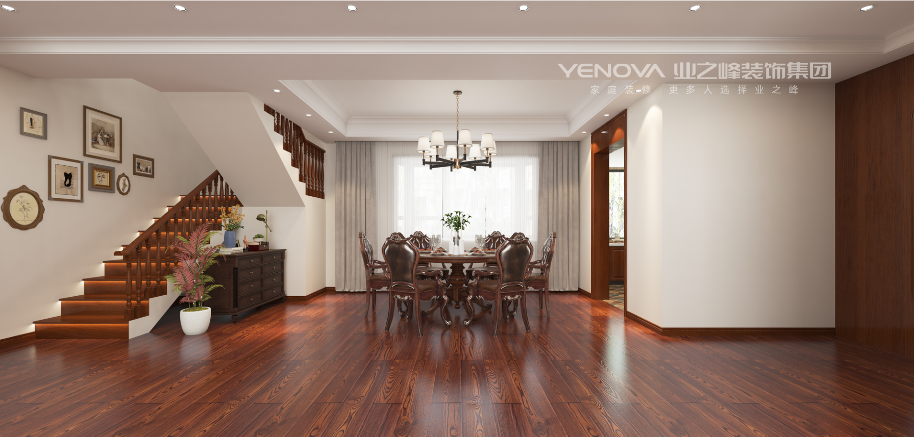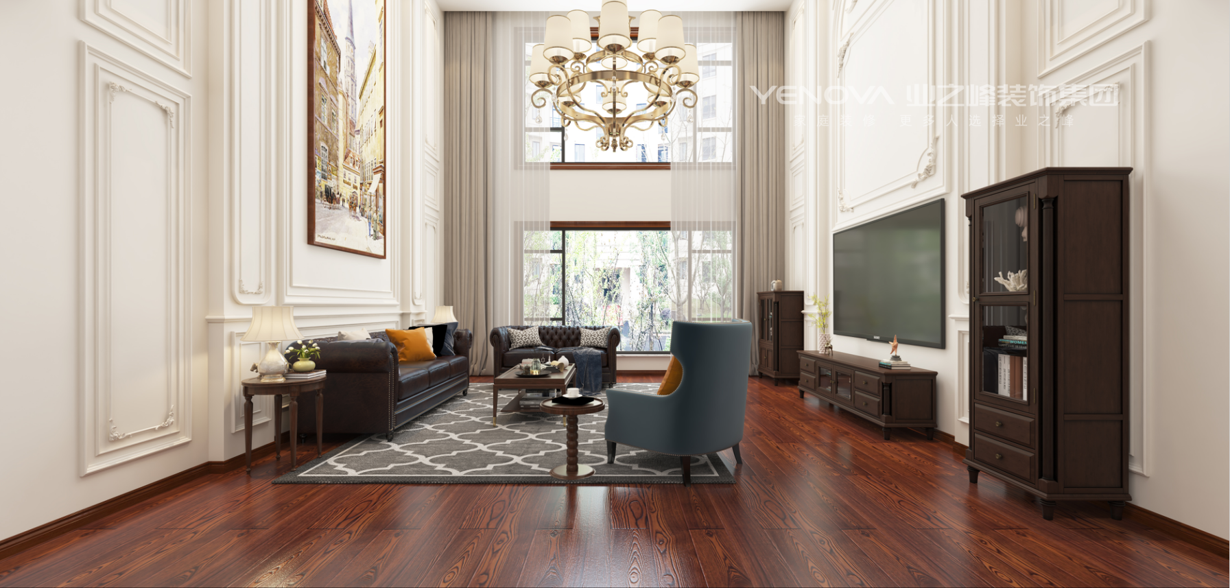 客厅挑高设计搭配白色护墙板、复古吊灯与深木色家具,大气又温馨;卧室以软包床头、精致地毯呼应整体风格,兼顾优雅与舒适;餐厨区用深木柜体搭配复古瓷砖,实用与美学兼备。